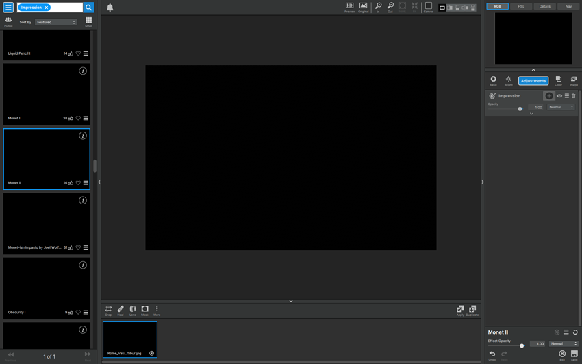 Unfortunately, the black screen problem (as detailed above) persists in both in Topaz Impressions 2 and Topaz Studio program, version 1.8.4. (In Topaz Studio, all of the filters work except the Impressions plugin section)