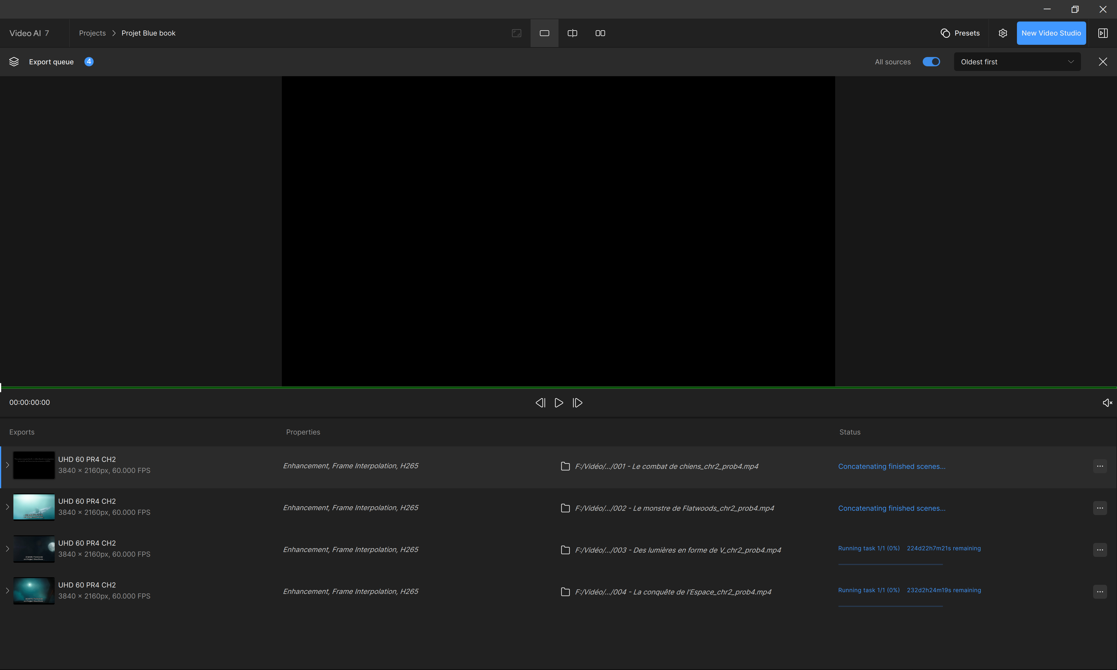 For each files, set it as > Output resolution: UHD/4K; AI model: Proteus; Frame interpolation: enabled; Frame rate: 60 fps; AI model: Chronos; Scene detection: enabled;
