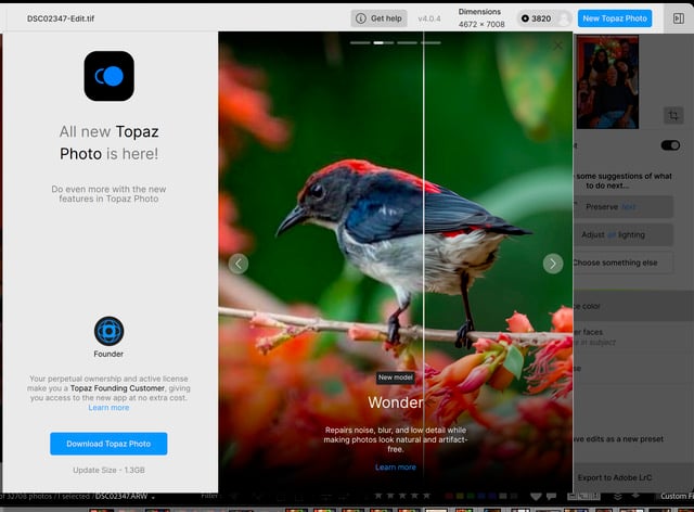 This is a picture of what i see when I go from LRC to Topaz Photo Ai. Inhave no choice for New Topaz Photo. It keeps telling me in the upper right corner that there is a New Topaz Photo. I click and update but the next time i go in from LRC to Photo Topaz Ai, the only choice i have, i see the same request. When i work with a photo, in Topaz Photo Ai, i see no difference in my edits. Definitly nothing close to your example of New Topaz Photo. Is Topaz Photo Ai and New Topaz Photo the same.