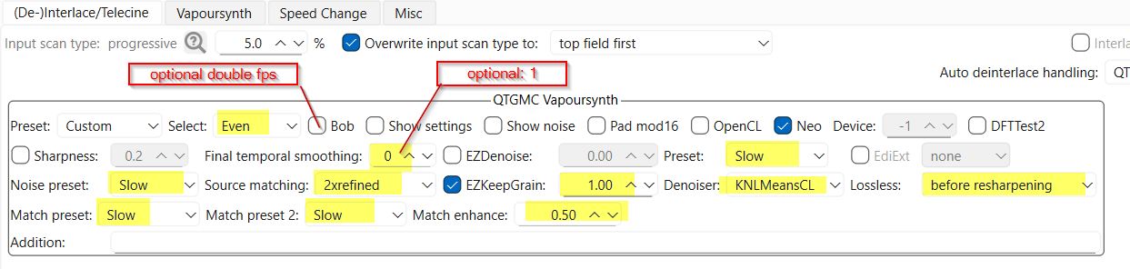 3 click and done, also since we talking about SD content, the processing is really quick in QTGMC and it’s worth it as you planning to keep the upscaled footage for long time after.
