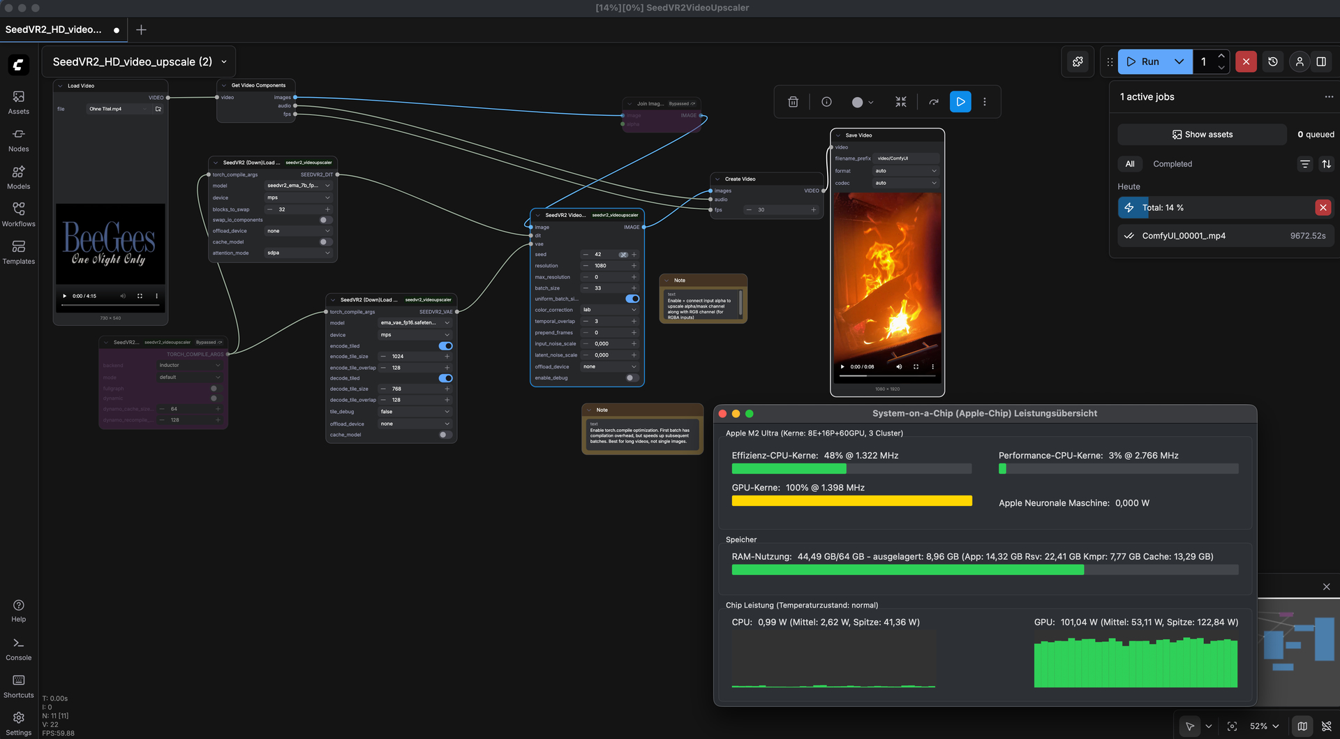 If the remaining time given is correct it seems to run at 0.66fps which wouldn’t be that bad for an M2 Ultra: 160 mins total rendering time (= 9600secs) for a 4:15 min:s clip (= 255 secs duration * 25 fps = 6375 frames). 6375frames/9600 secs = 0,66fps.Now, only the output quality has to be good enough.