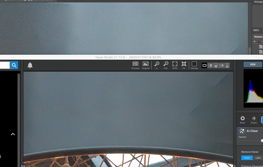 I’m not sure about this. Anything you normally work on you see what you get. I can’t see trying to guess what it may look like back at LR or at what ISO it stops being usable. It is supposed to be AI. I have it set to medium and sharpness low. The upper part is back at LR and AI Clear is below. It should look like it did in when in Topaz Studio. This can’t be right. Unless AI Clear is a light noise correction and sharpening enhancement plug-in.