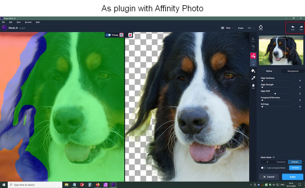 When you use MAI as plugin (I realize youāre more of an Affinity dude than a Ps dude) are the Undo and Redo buttons/swirls active for you? Or, do you see them greyed out also? It may just be something to be fixed in Ps. That is definitely not a function that one would handle back in Ps. The mask has to be refined and may need some do-overs before it gets back there.