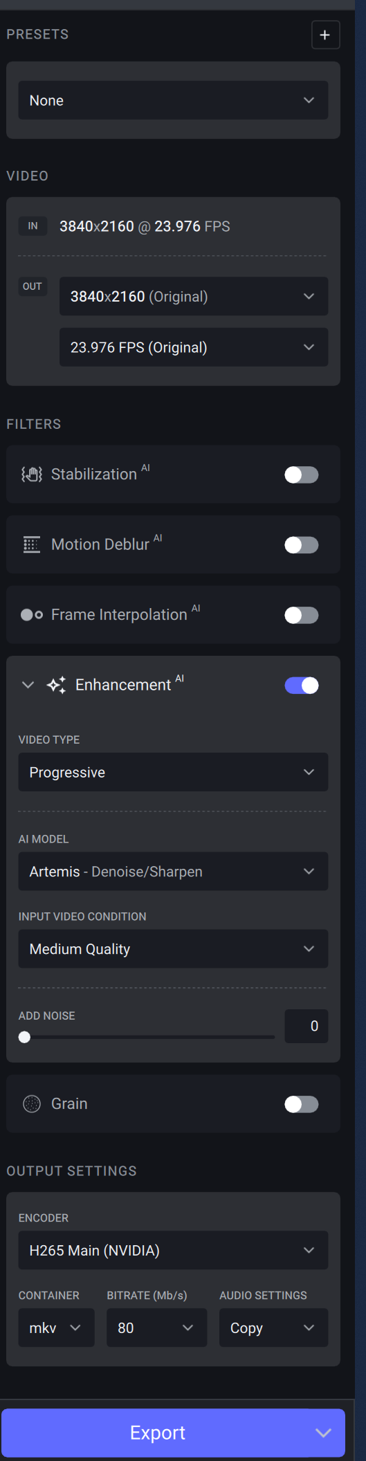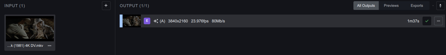 ffmpeg “-hide_banner” “-nostdin” “-y” “-nostats” “-i” “Raiders of the Lost Ark (1981) 4K DV.mkv” “-sws_flags” “spline+accurate_rnd+full_chroma_int” “-color_trc” “16” “-colorspace” “9” “-color_primaries” “9” “-filter_complex” “tvai_up=model=amq-13:scale=0:w=3840:h=2160:device=0:vram=0.9:instances=1” “-c:v” “hevc_nvenc” “-profile:v” “main” “-preset” “medium” “-pix_fmt” “yuv420p” “-b_ref_mode” “disabled” “-b:v” “0” “-map_metadata” “0” “-movflags” "frag_keyframe+empty_moov+delay_moov+use_metadata_tags+write_colr " “-map_metadata:s:v” “0:s:v” “-map_metadata:s:a” “0:s:a” “-c:a” “aac” “-b:a” “192k” “-ac” “2” “-metadata” “videoai=Enhanced using amq-13” “Raiders of the Lost Ark (1981) 4K DV_amq13_temp.mov”