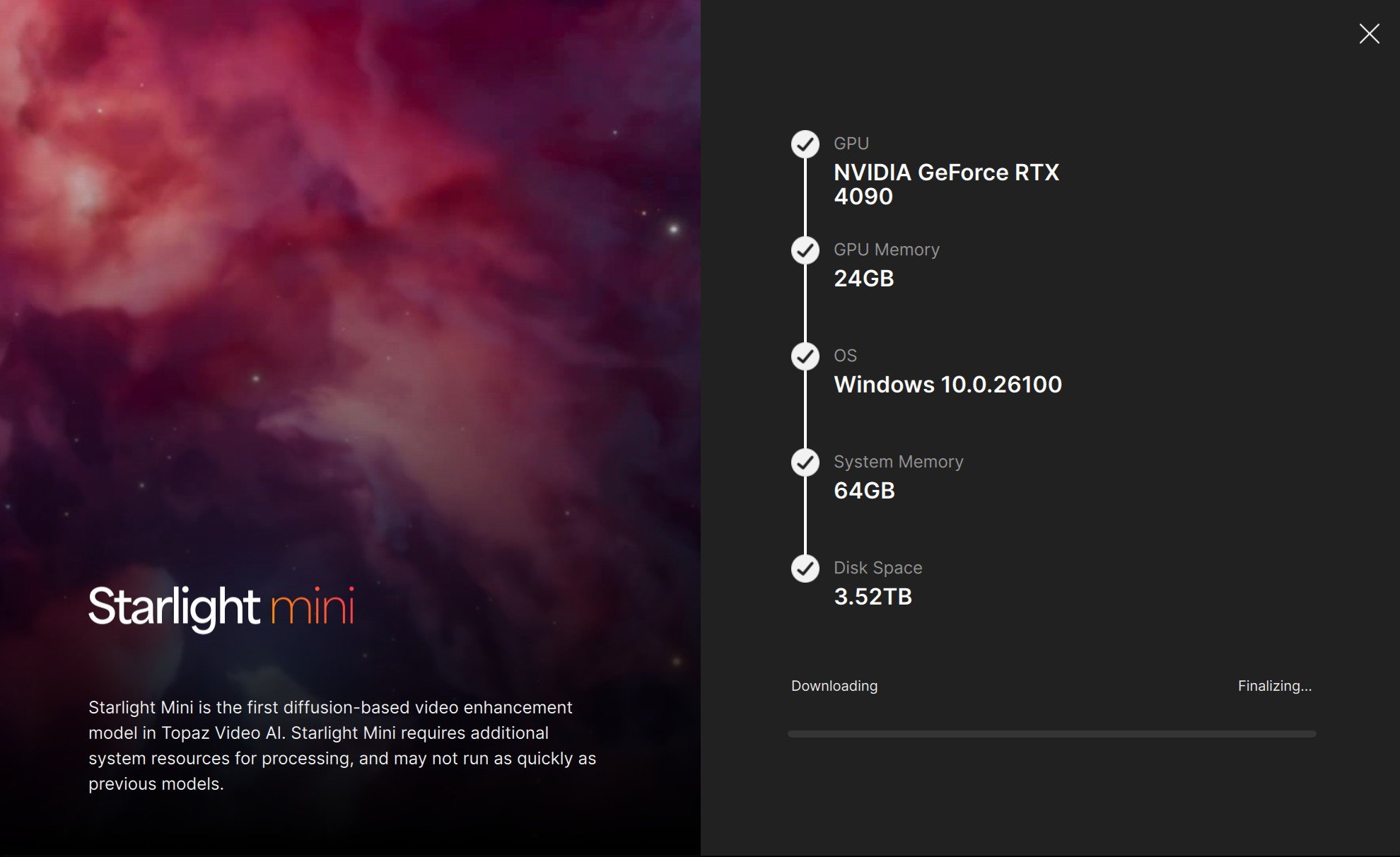 Hello David, just an update and a couple of questions for you. I was able to use Handbrake to create a MP4 file. I ran some tests like upscaling to 4K just to start experimenting and learning. Video AI then recommended Starlight Mini and ran a check on my machine to determine if it was capable. It is, so I tried to download it which did not work and got hung up. I pinged Topaz help and looking at my logs recommended to uninstall and reinstall from 7.1.5 back to 7.1.0 as there was a known issue. That fixed it and I was able to download Starlight Mini and ran a small test file through it with good results.
