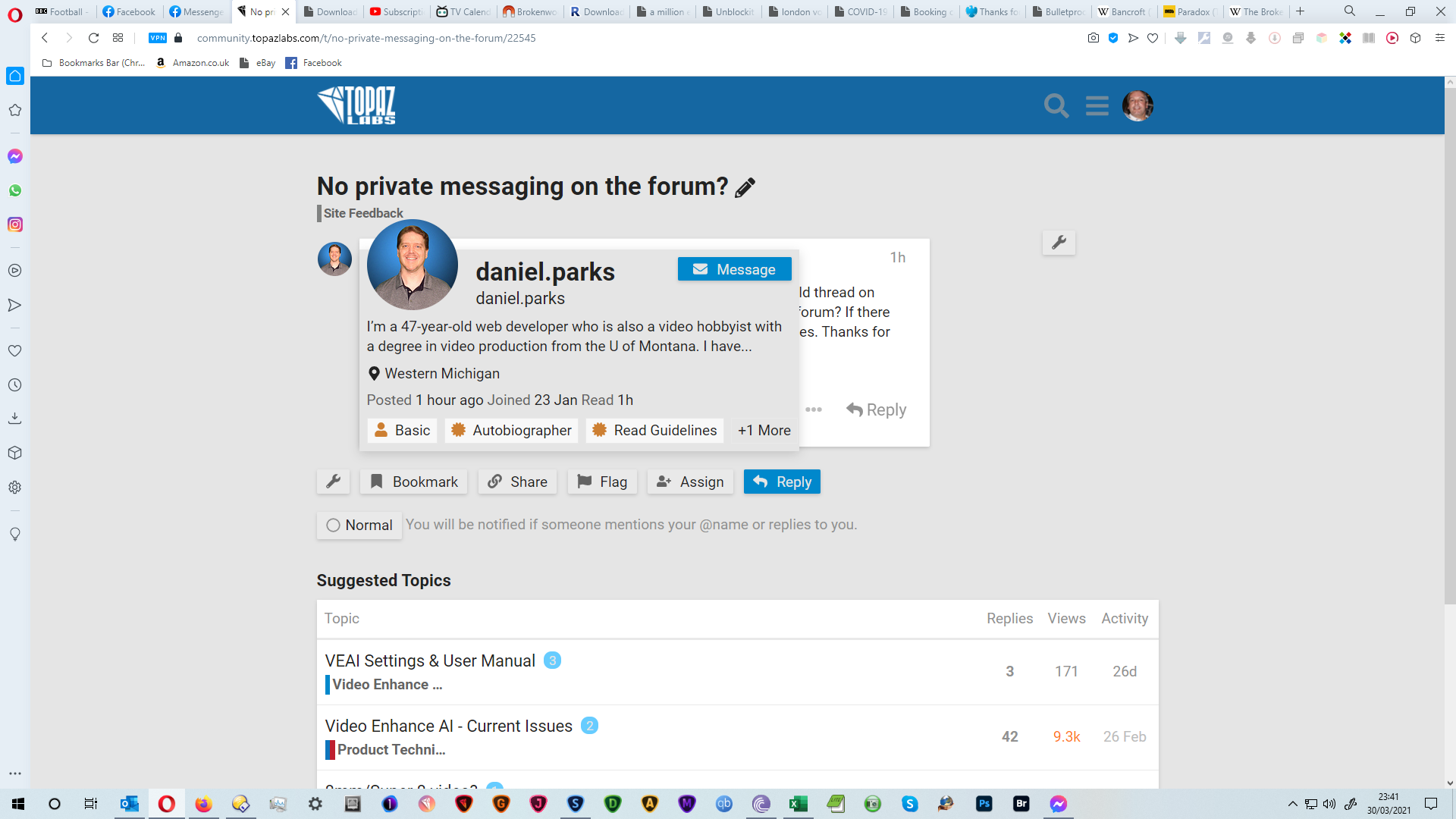 It’s been a while since I posted the original post above. I have read much on this forum and posted numerous times, earned some badges, but still no option to message anyone when I click on their profile icon.