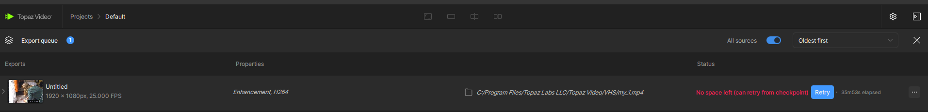 Then the export stops and shows: “No space left (can retry from checkpoint)”.