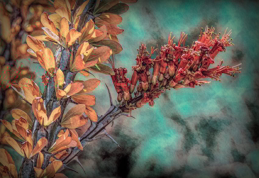 I liked the yellow flowers and juxtaposition of this great bunch of flowers. Ocotillo is a strange cactus here in the sonoran desert that looks dead much of the time but when exposed to water or other conditions grows green leaves and red flowers then the yellow leaves fall off and it goes back to being a stick. Before and after using basic adjustments then an ai-remix over a saved preset of mine.