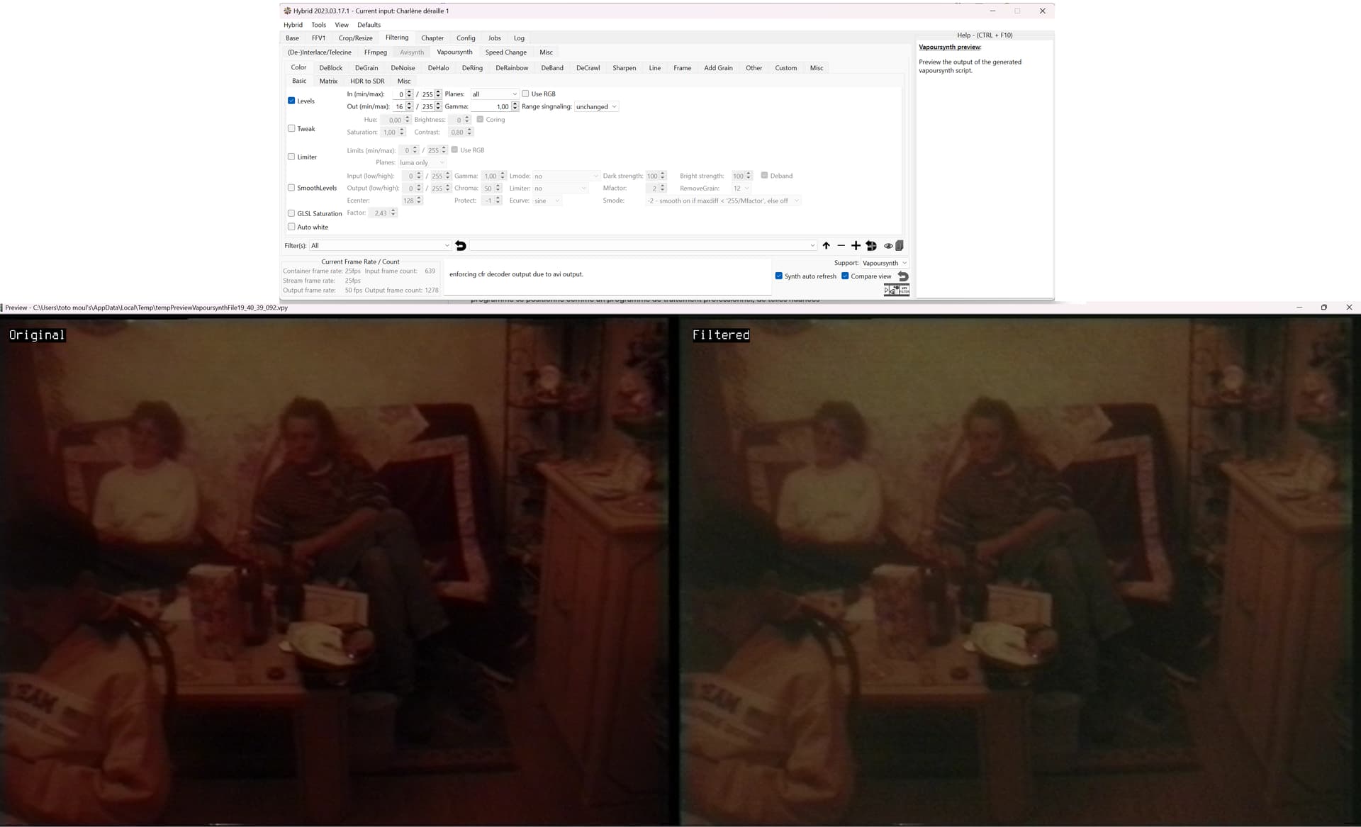 I can’t manage to play with the contrast in hybrid, if I decrease it, the image is darker, if I increase, the whites are too burnt and it brings out more noise, so I tried to play with it the level by setting 0-255 in “in” it gives me this image aspecty which looks clearer but the colors are modified, and I can’t see if it looks more natural with this scene of the video. I will try to produce like this, do a test with vai and see if I can correct the colors afterwards.