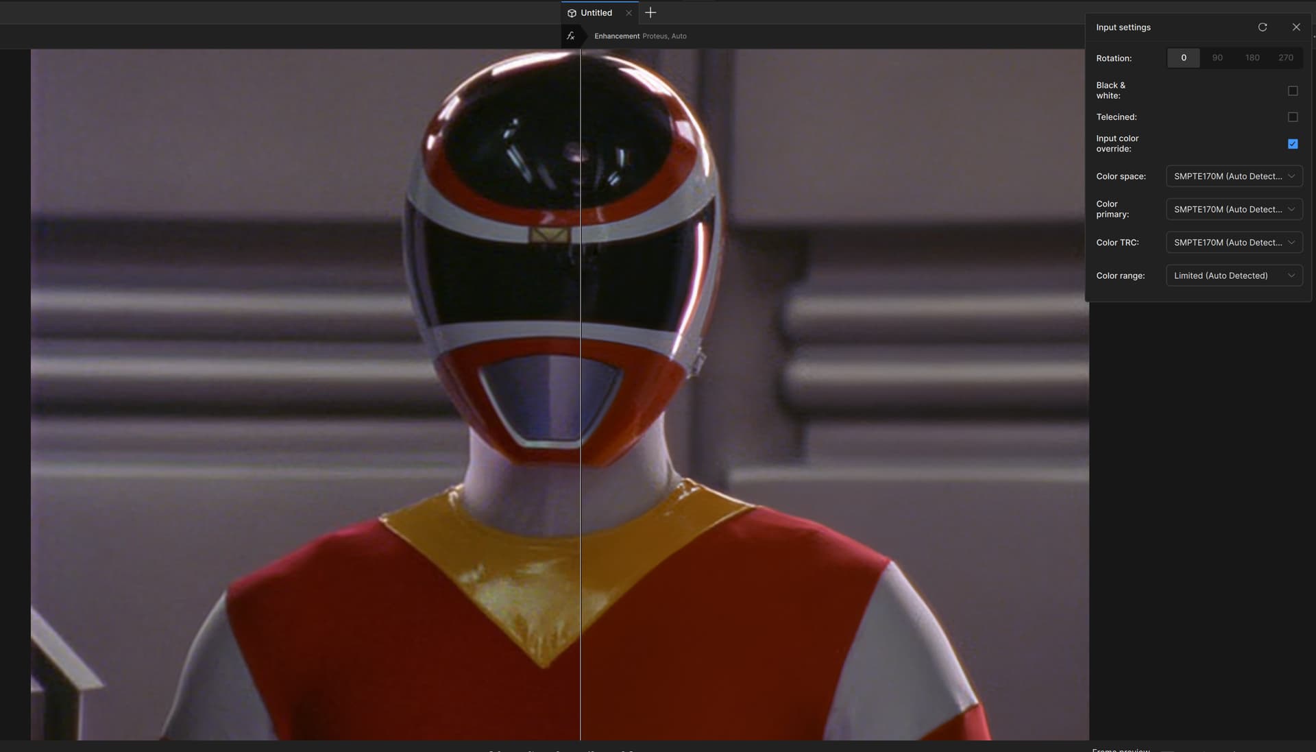 Sample screenshot, note that the input preview (left) appears to be correct, while the output preview (right) appears to be assuming BT.709 even though the input is not BT.709 and Topaz Video is aware of this noted in the auto-detected settings: