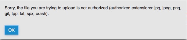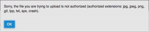 Sorry, the file you are trying to upload is not authorized (authorized extensions: jpg, jpeg, png, gif, tpp, txt, spx, crash).