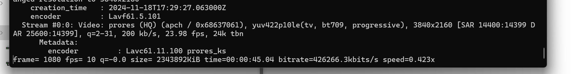 ffmpeg “-hide_banner” “-i” “F:/jobs/repo-00.01.16.497-00.02.09.085.mkv” “-sws_flags” “spline+accurate_rnd+full_chroma_int” “-filter_complex” "crop=w=1920:h=816:x=234:y=132,tvai_up=model=prob-3:scale=0:w=1452:h=816:preblur=0:noise=0.32:details=0:halo=0:blur=0:compression=0.18:estimate=8:blend=0.2:grain=0.01:gsize=2:device=0:vram=1:instances=1,scale=w=3840:h=2160:flags=lanczos:threads=0:force_original_aspect_ratio=increase,crop=3840:2160" “-fflags” “+flush_packets” “-c:v” “prores_ks” “-profile:v” “3” “-vendor” “apl0” “-quant_mat” “hq” “-bits_per_mb” “1350” “-pix_fmt” “yuv422p10le” “-an” “-map_metadata” “0” “-map_metadata:s:v” “0:s:v” “-movflags” “use_metadata_tags+write_colr” “-bf” “0” “-metadata” “videoai=Enhanced using prob-3; mode: relative to auto; revert compression at 18; recover details at 0; sharpen at 0; reduce noise at 32; dehalo at 0; anti-alias/deblur at 0; focus fix Off; and recover original detail at 20. Changed resolution to 3840x2160” “H:\veai/repo_560787555.mov”