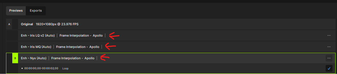 When it is done rendering, I will go through each video, select the best preview for that video (perhaps make smaller changes and re-render that preview but usually the settings I know are good for each model, works). Select export for that video. If all the selected sources were clips from the same initial source (I often cut them in premiere) I would likely copy the settings from clip to the rest and export, but this option already exists.