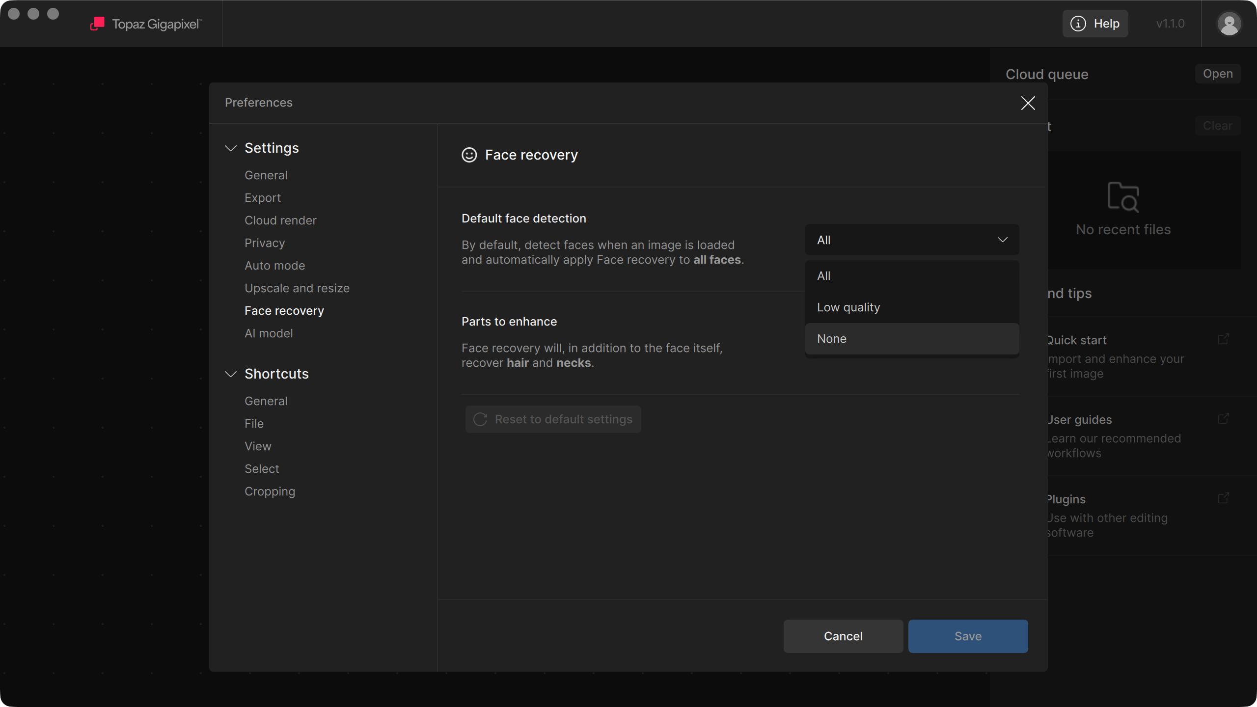 Topaz Gigapixel v1.1.0 was released with a preference to set Face recovery default to None.