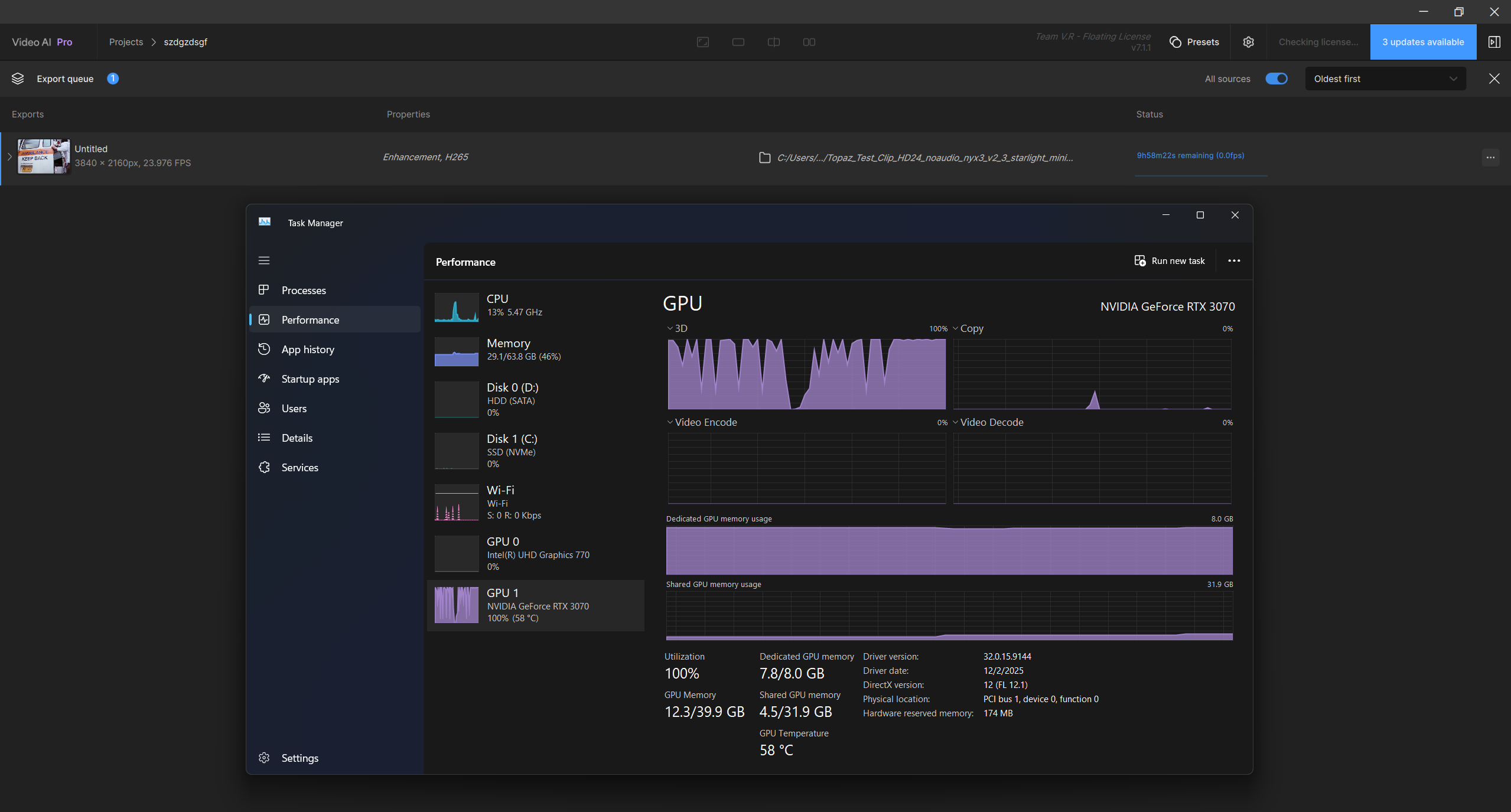 The Bus Interface Load is also at 100% while using HD→4K Artemis Medium on the RTX 5070 Ti System, although in this case the RTX 4070 Ti SUPER is only slightly faster (approx 9,4fps) than the RTX 5070 Ti (approx. 8,9fps). This may be an indication on where the issue is here.