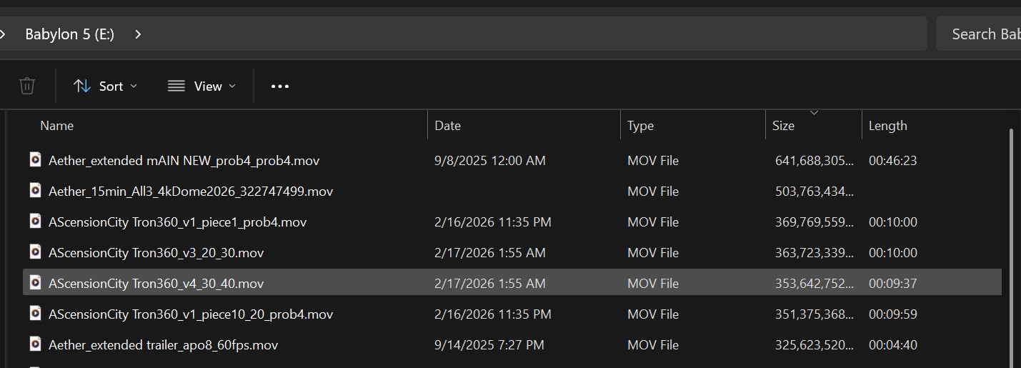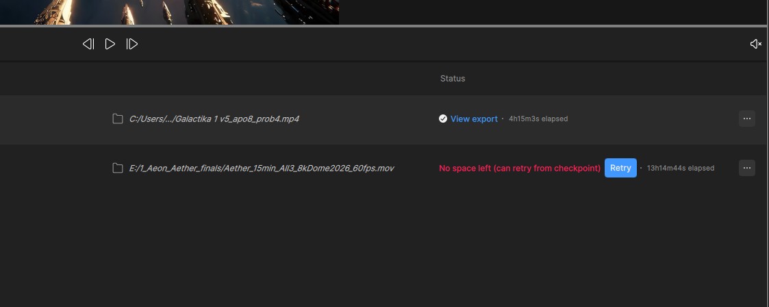 I’m doing these massive 8k conversions on a 4096x4096 domeshow and i am doing it from 1 ssd to another ssd - both drives have close to a terabyte avail so does my main drive - the end file is 640gigs roughly but it keeps giving me this out of space error and when i look all drives have plenty of space -plus it often leaves multiple copies of the file on 1 pic u can see 3 copies all close to being done but not . those numbers are in gigs so they are huge - same date more than a 1 1/2 TERABYTES of storage its sucking up - the longer list one with the single file with no time is just cuz its stil thinks its live in the software and waiting for me to retry from checkpoint