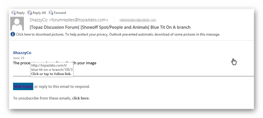 So here are two screenshots. First one is of the email I received. I’ve hovered over the “Visit Topic” so that I can capture where the link is to