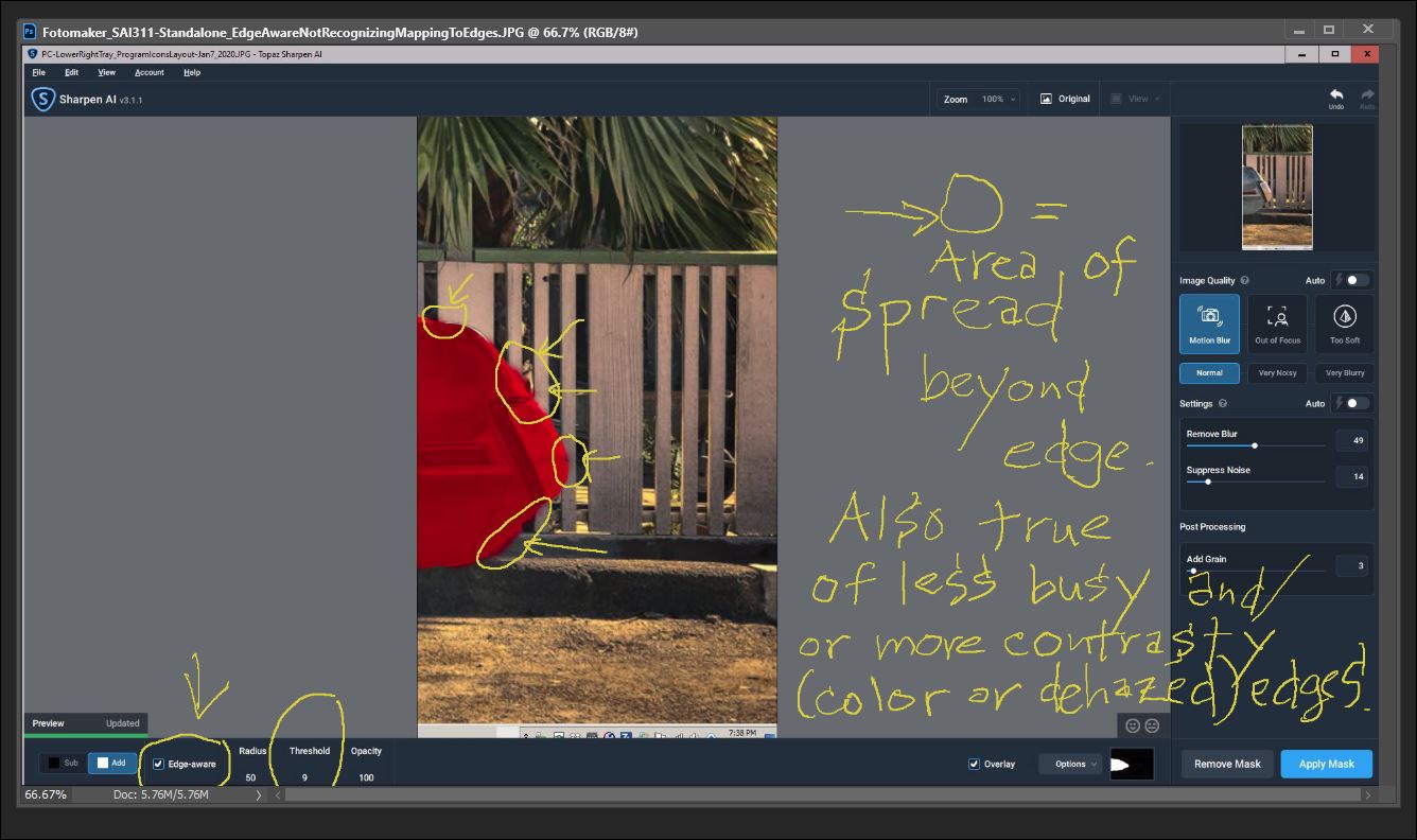 Snip of latest (best attempt of various size/threshold tries) result of Edge Aware in this rel. of SAI. As noted on the snip, I get the same type of results even with images that have more distinguishable edges (color, clarity, dehaze) in other images too:
