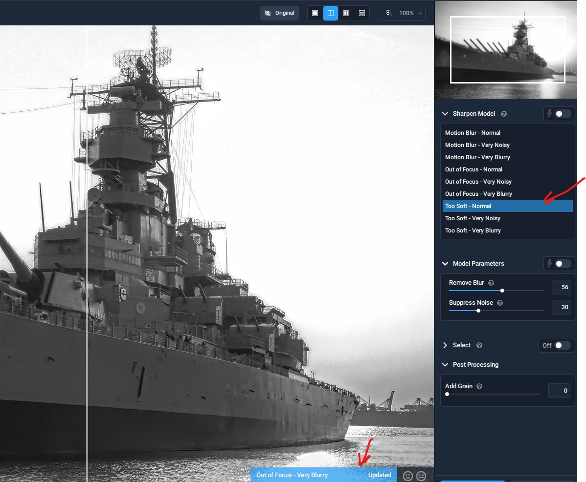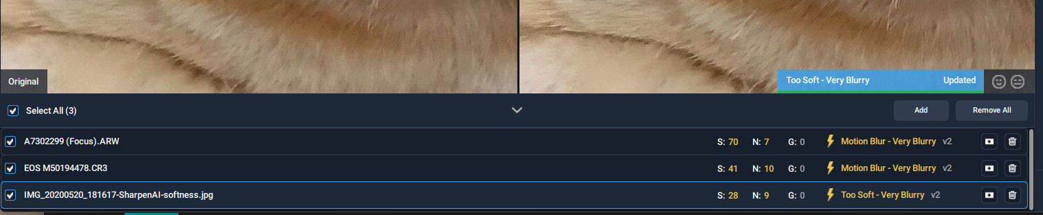 Anthony, I don’t know if you have seen this bug in V3.3.3 . I think it is also in Denoise so it may be in a common software module. After selecting Out of focus and processing the preview, I selected Too Soft and the label didn’t change. This happens numerus times with different selections.