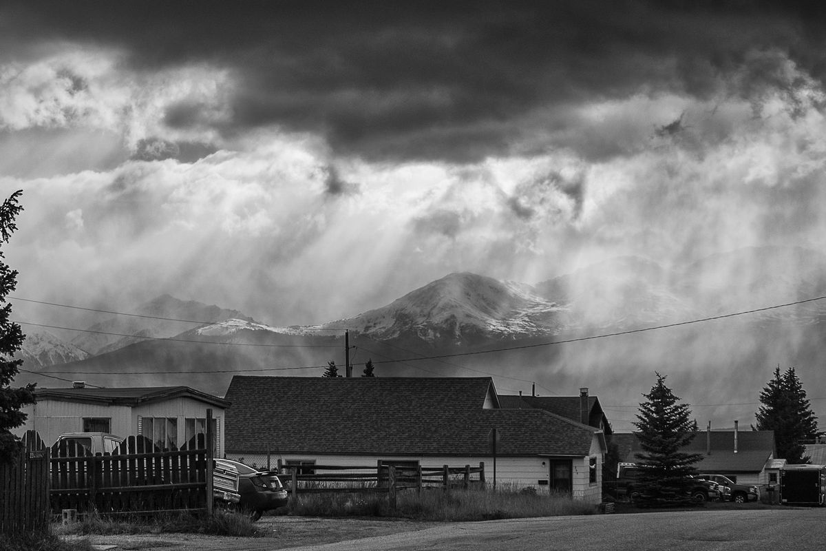 This image is from a trip to Leadville, CO in 2013. A snow storm was passing through in the afternoon. I went out in front of my rental cottage to check the weather just as the sun was starting to fight back. Always like the chance to photograph sun rays.