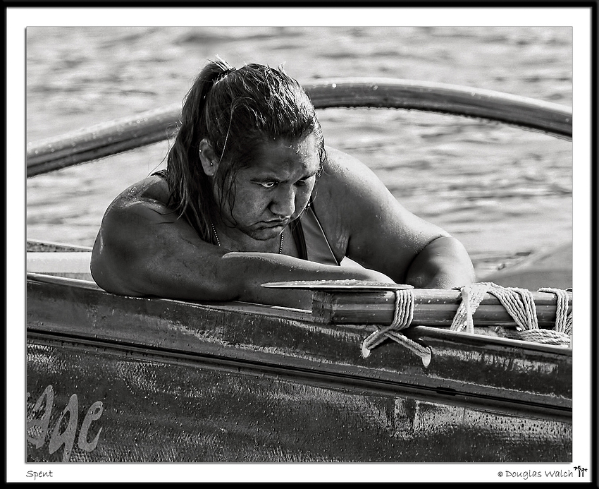 So this totally exhausted woman just finished paddling, in an all woman’s crew, 18 miles in the Queen Lili’ulkalani Canoe Race 2011. Strong teams finish in 2.5 hours. This woman was sitting in seat three. Often referred to the Power Seats, the heavier, stronger paddlers will generally sit in either seat three or four. It is their primary task to provide the brute power required to push the canoe along – racing eighteen miles, 2.5 hours or more, in open-ocean!