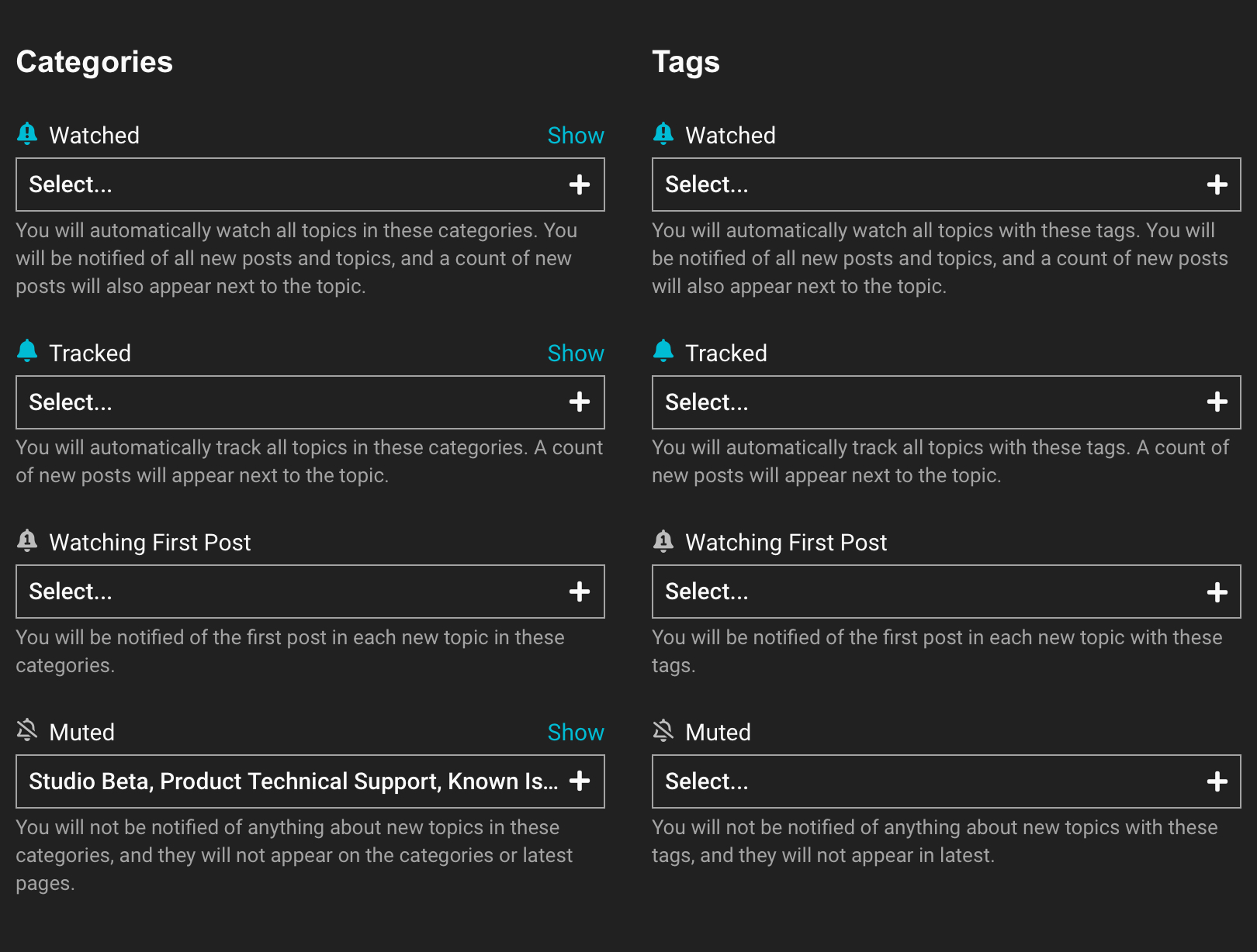 Have a look at the available sections which are called categories … tweak your settings on your profile by selecting the categories you want under Profile, Tracking.