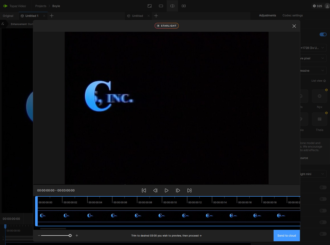 BUT when I click on “Cloud export” I am presented with a window that says “Trim to desired 03:00 you wish to preview, then proceed”. I don’t want to preview. I just want to render the entire film. If I pick a 3 minute section and click “Send to cloud” then I’m presented with a window that says: