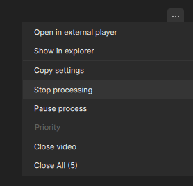 The stop processing option though should terminate the export completely at that time and free up your resources to move on to the next video in the queue.