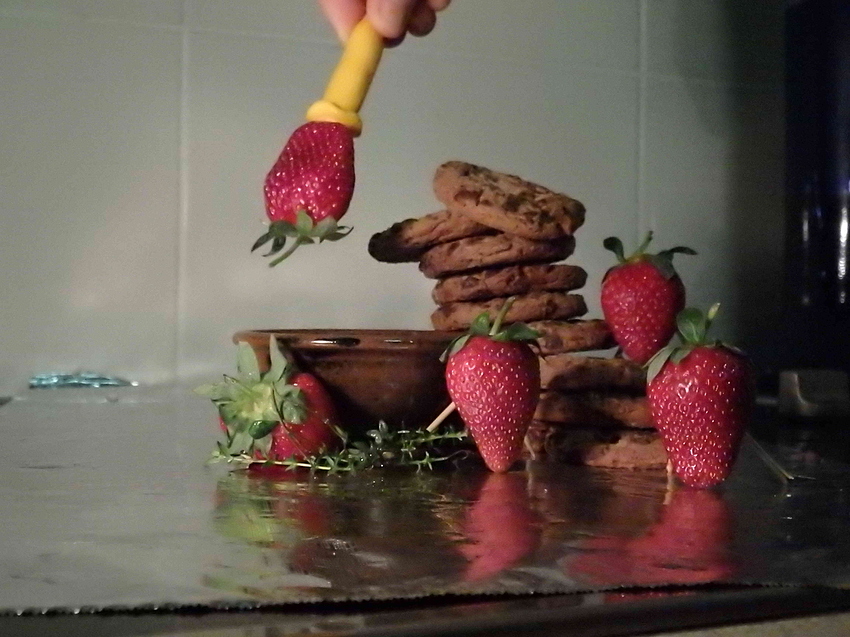 The strawberry had actually climbed to the top of the cookie pile and was captured mid dive into the chocolate sauce that is in the bowl below ![]()