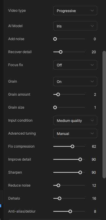 For each new video, click “Estimate” again so it finds the optimal settings for the video. Then, set “Improve Detail” and “Sharpen” to 90. I use “1” for the “Grain Size,” but you can also set it to 2 for larger videos.