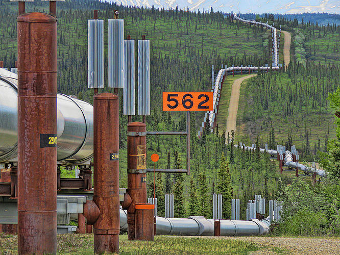 A very small portion of the Trans-Alaska Pipeline System (TAPS). About half of the 800 mile long pipeline is above ground due to perma-frost. The zig-zag pattern of the line helps deal with the huge temperature range experienced by the system. TAPS is in its 40th year, far longer than the 25 years predicted for the system to remain operative.