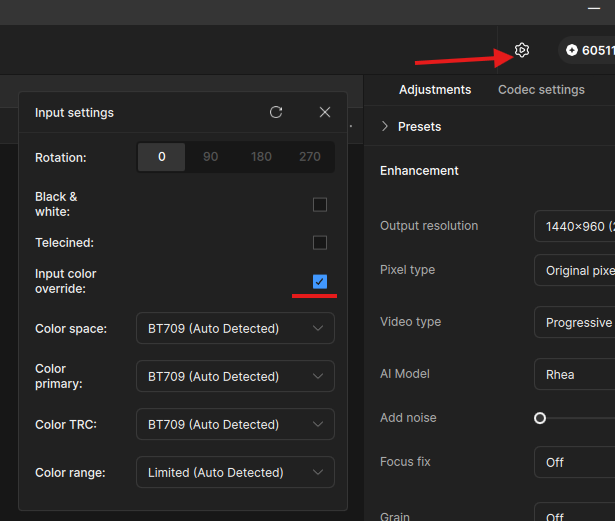 In the top right corner, there is the input settings option and you can override the color profile there if you want to see if that helps.