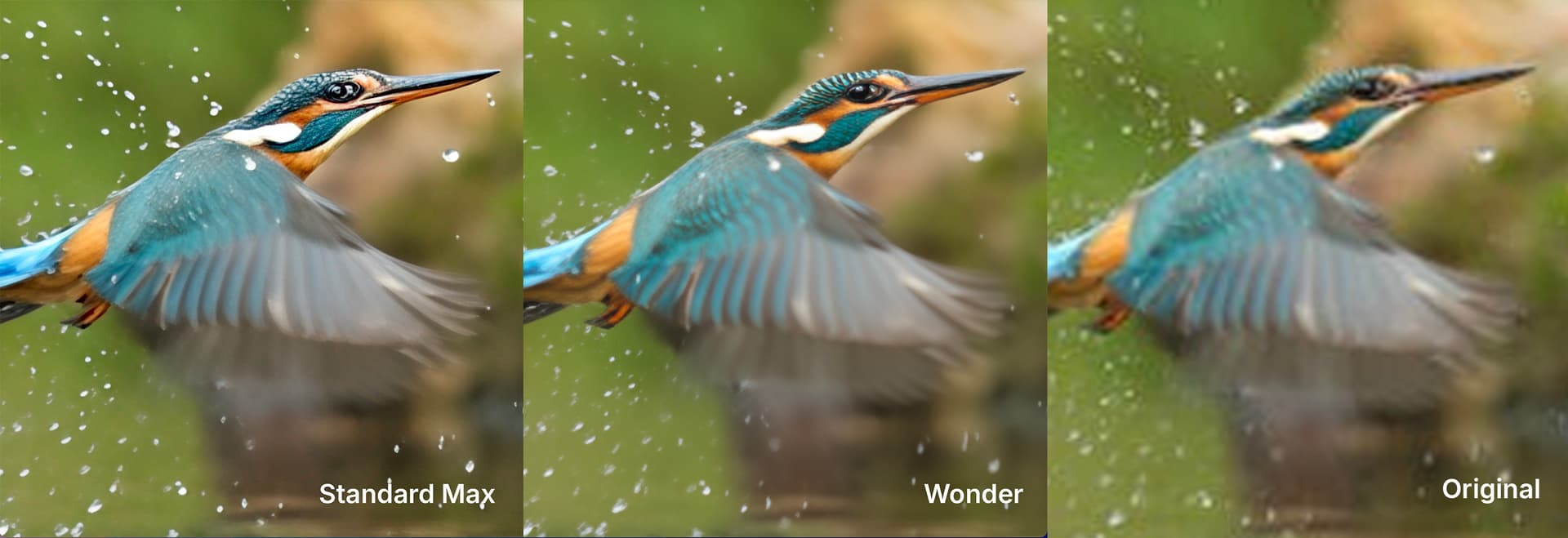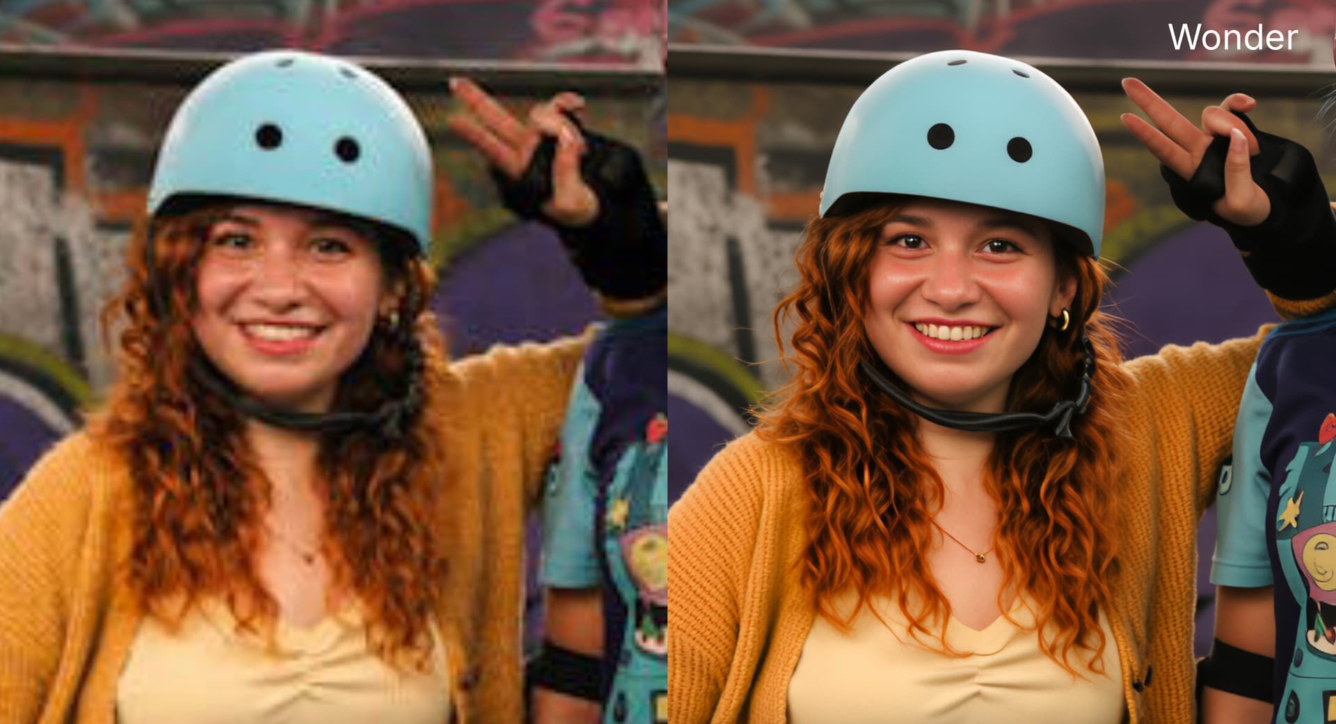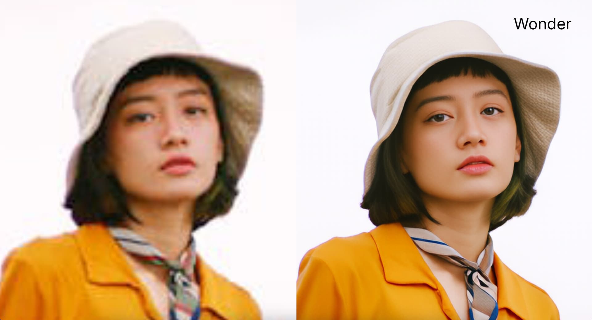 Check out the subtle difference in output where Wonder maintains the integrity of the background and does not add oversharpened artifacts on the right side of the image.