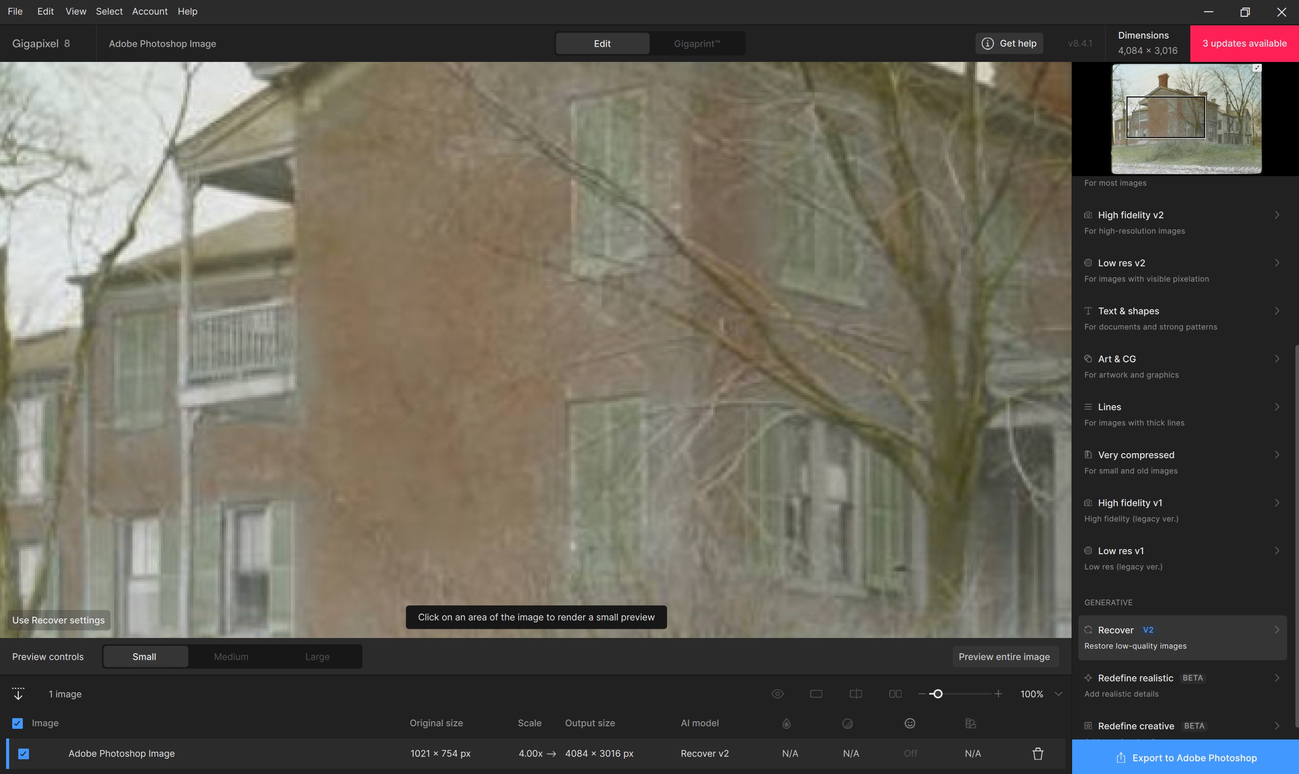 I just upgraded to 1.0.2 from Gigapixel AI 8.4.4 and am now getting this error when the preview tries to render. I submitted feedback through the help option but wanted to add it to this thread as well in case anyone had any possible solutions.