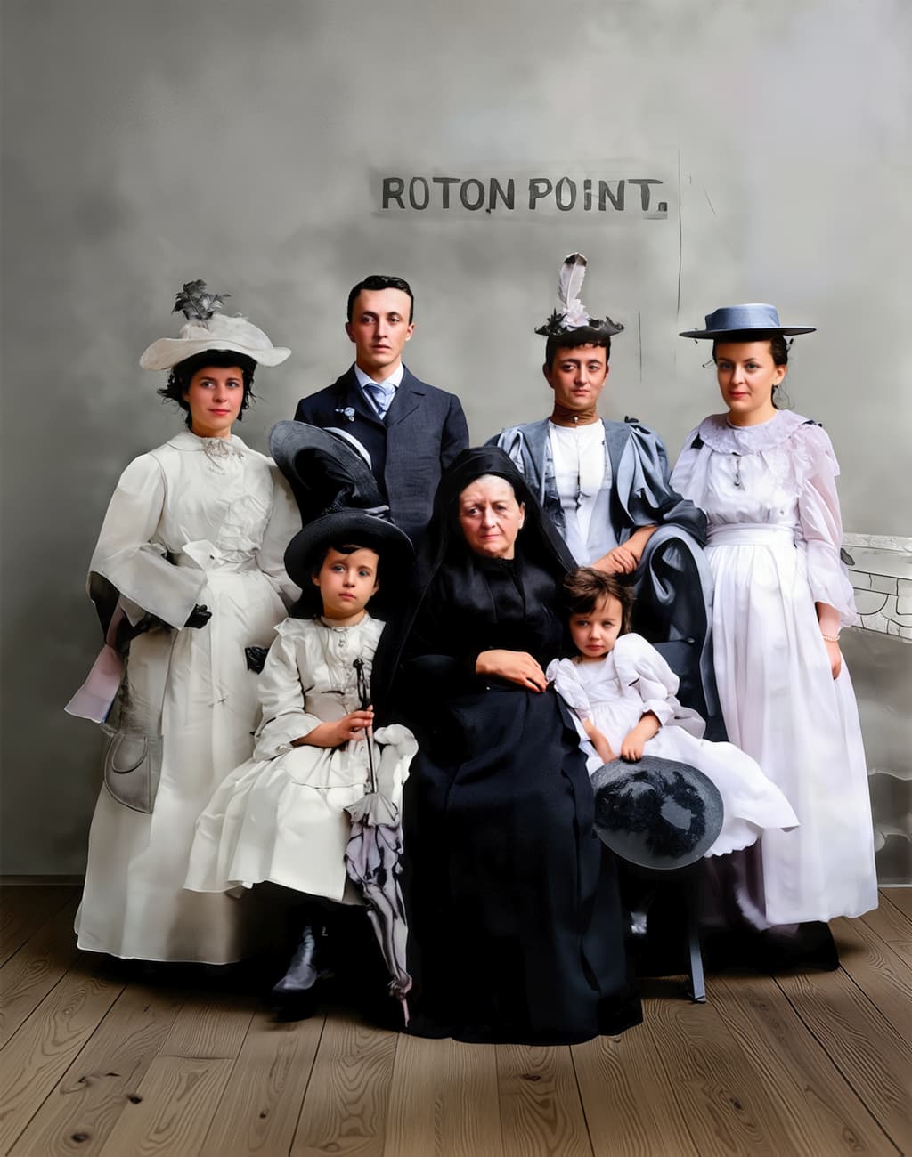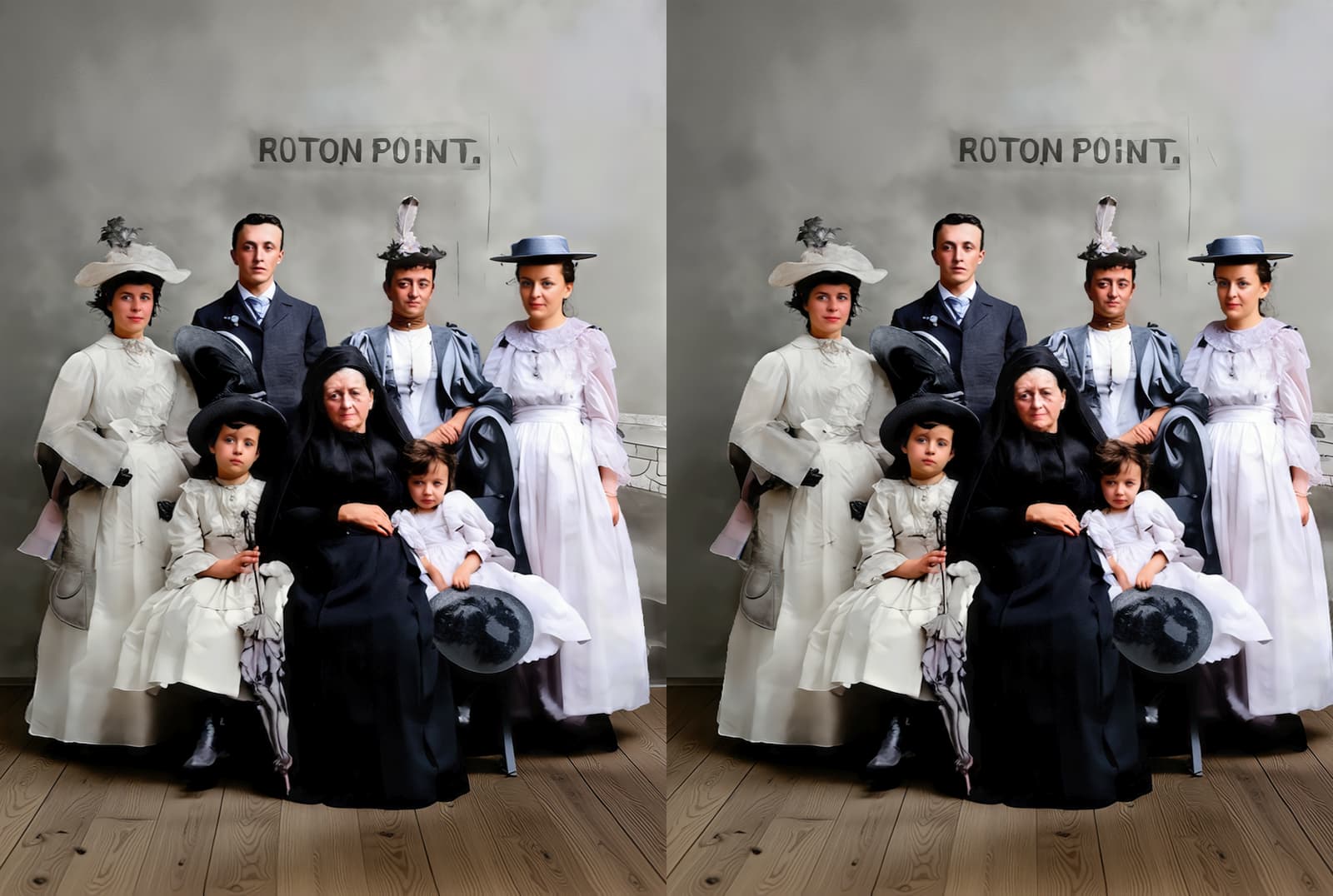 I did another attempt on the original image, first using “Flux-Kontext” with the prompt “restore the old 19th century family photo, remove dust and scratches, make a clear sharp high quality color photo, remove the stains from the smooth gray wall. The floor is made of rough wooden beams. Keep all details, keep the sign on the wall.”