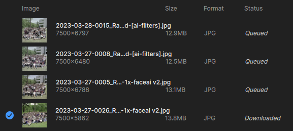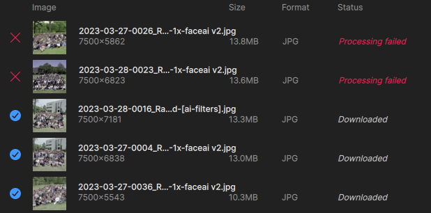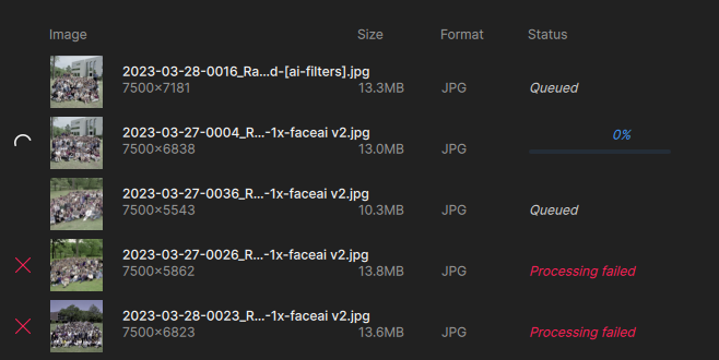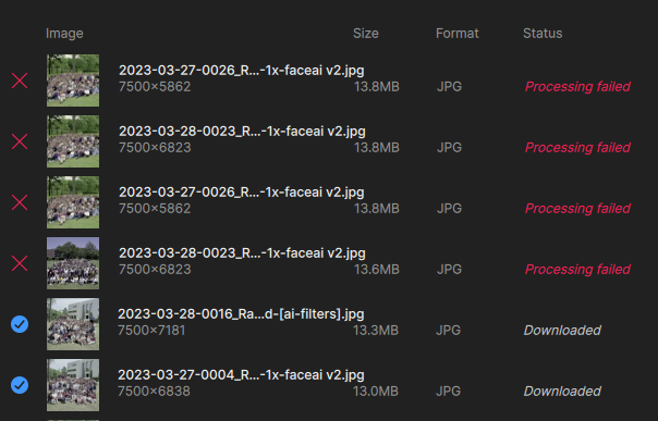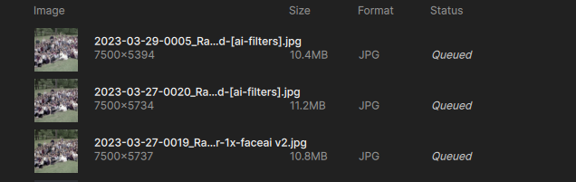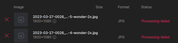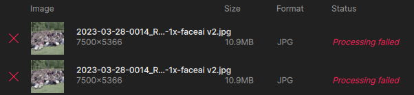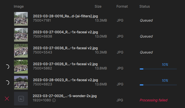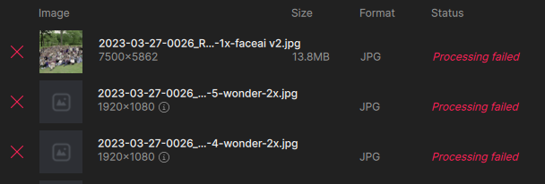 I’m noticing something else when adding images in batches to a queue – the model settings do not apply to the entire queue (even though I thought all images were checked)! This may be why I’m getting failures (some trying to enlarge to 2X when it’s not supported). UPDATE: This latest batch is behaving as expected, all selected images changed to “Wonder” at once.