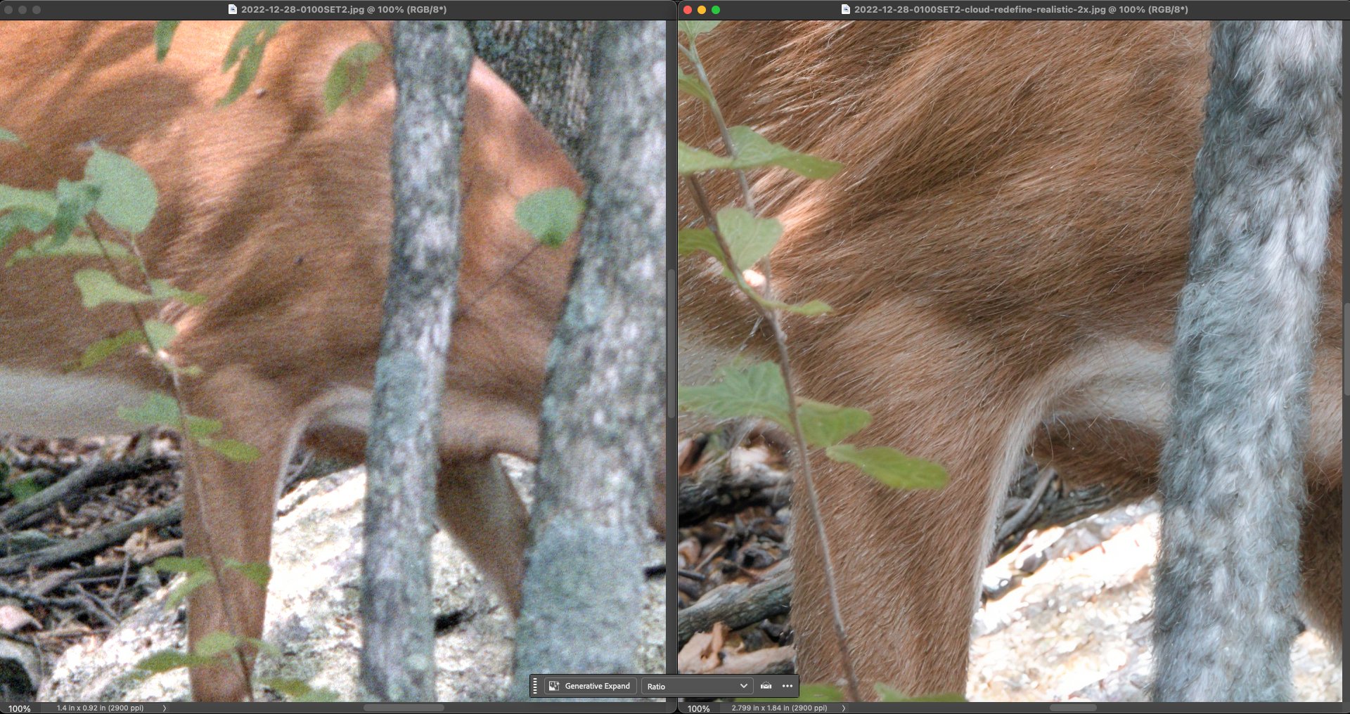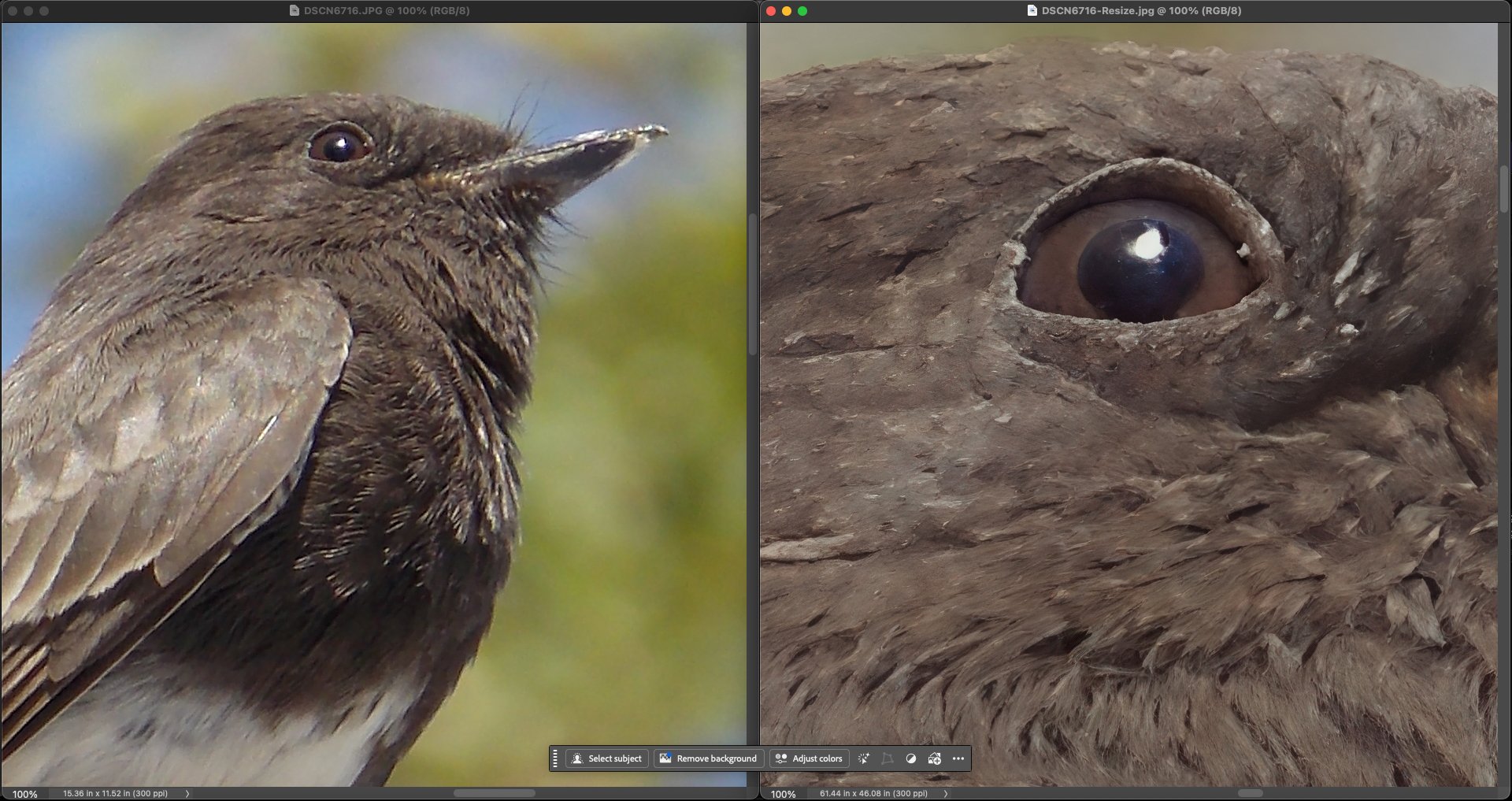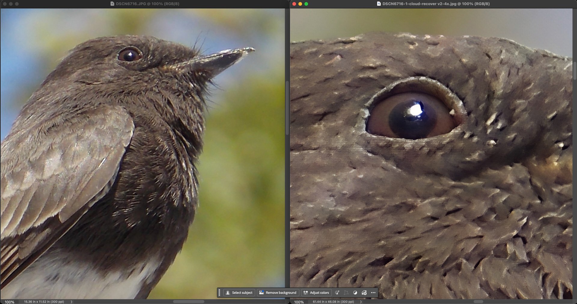 The texture is better with On1 Resize. It’s always useful to have several different software programs and models to see which one will be best depending on the source image.