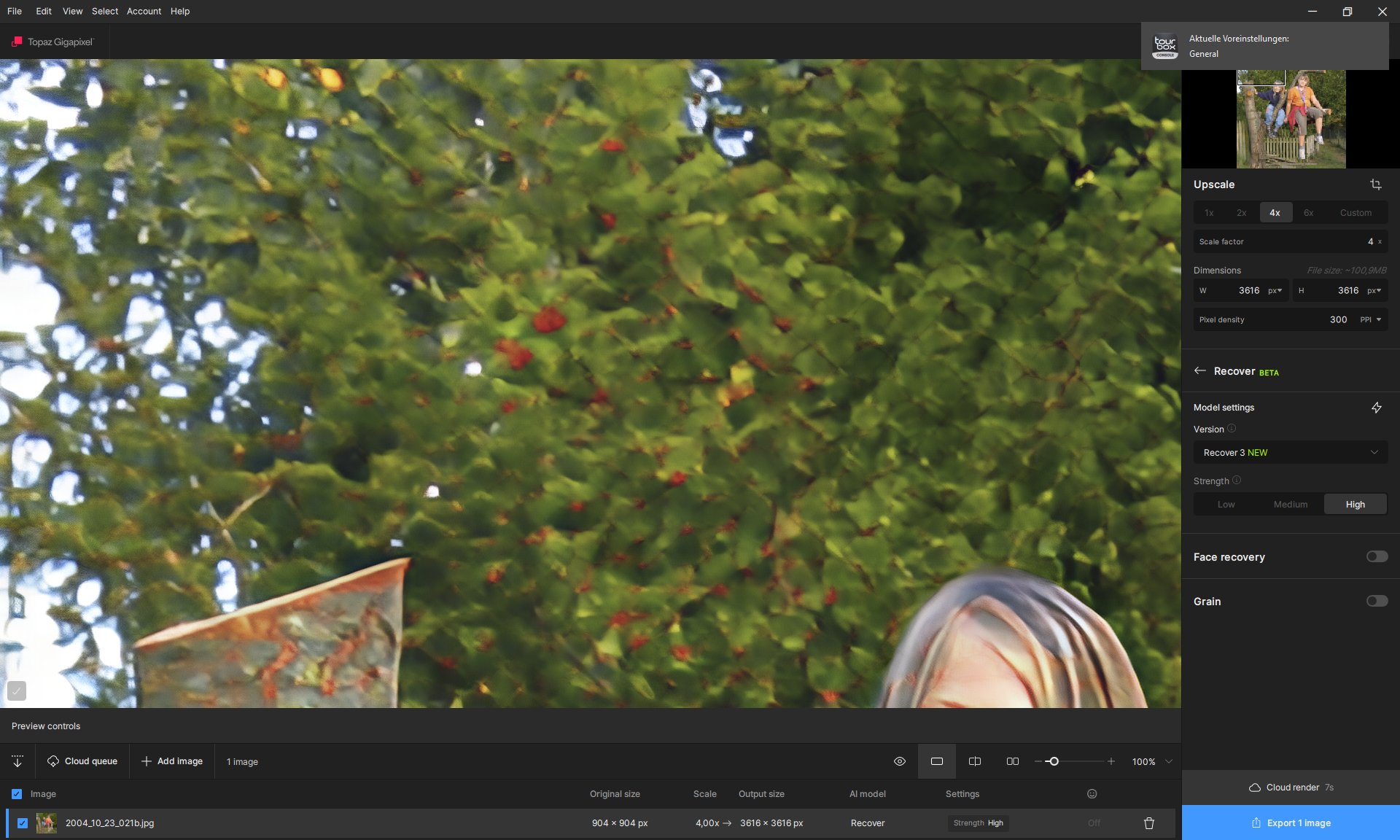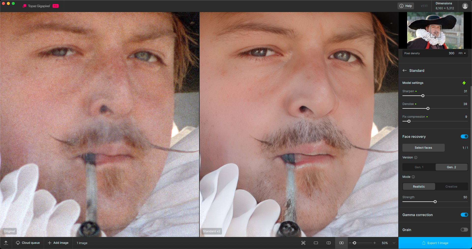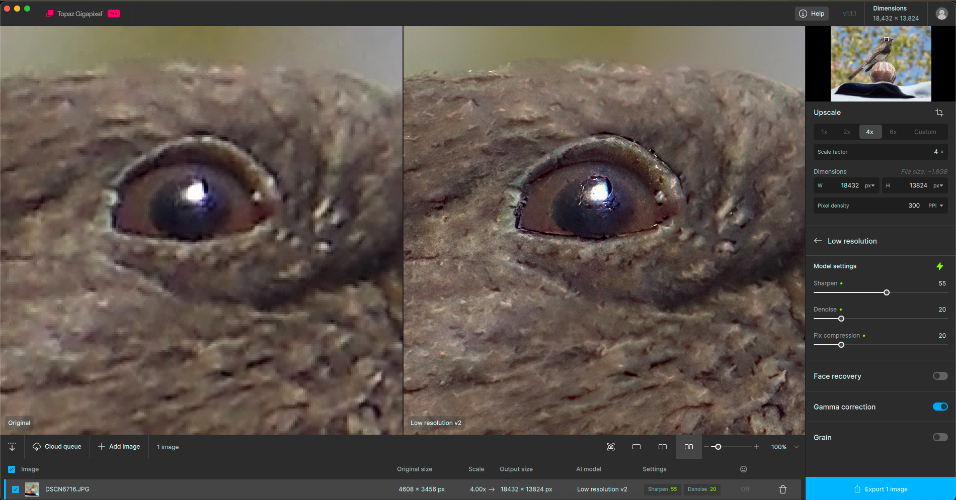 The texture is better with On1 Resize. It’s always useful to have several different software programs and models to see which one will be best depending on the source image.