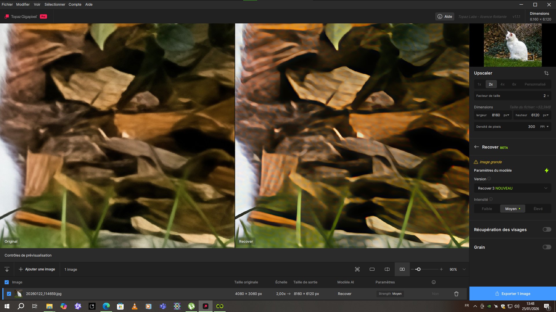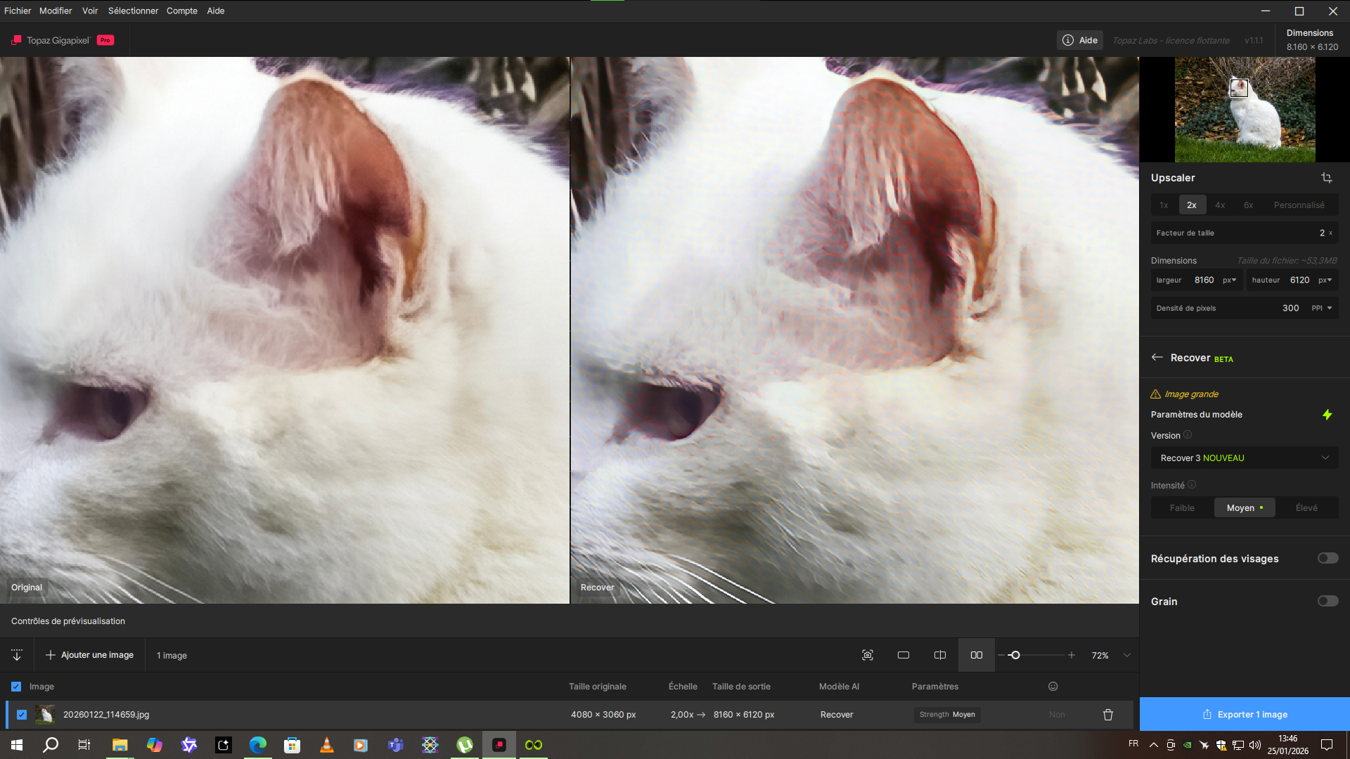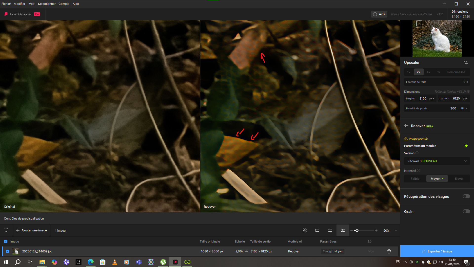 On a 12.5 megapixel photo (4080 x 3060 pixels), I tested Recover V3 with a 2x upscaling. The result isn’t amazing, although it did take quite a while to render. In addition, there are clearly visible red alveolar artifacts on the cat’s ear.