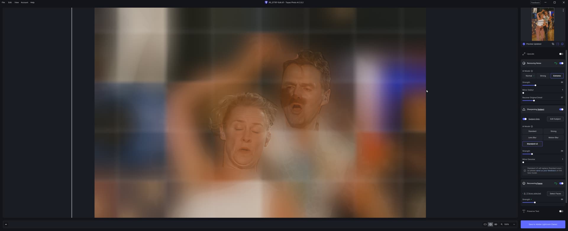 Iâve done about 50 or so photos from the same competition, all using pretty much the same settings in Photo AI - Extreme Noise, Standard V2 Sharpen, and Face Recovery. Iâve had just one other problem where it somehow converted the noise to stubble on a dancerâs face. Again rerunning from Lightroom cleared the issue