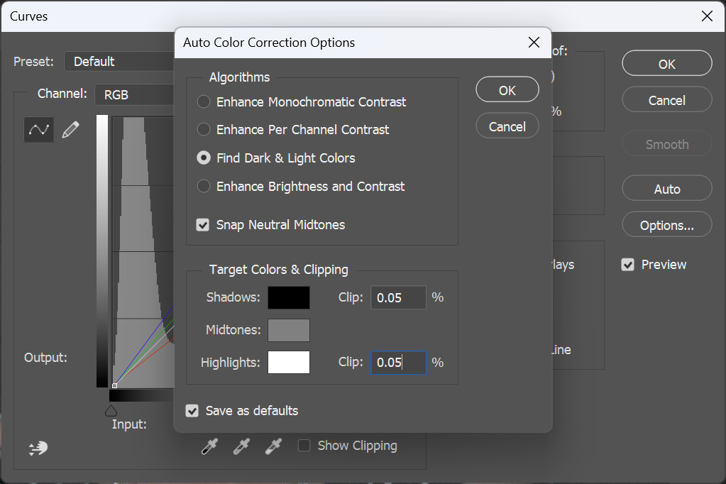 Yes, I’ve set my preferred Auto algorithm for Curves in Ps too. I mostly don’t use Auto. But it’s helpful to see what it offers up. I generally have mine set for “Enhance Brightness & Contrast”.