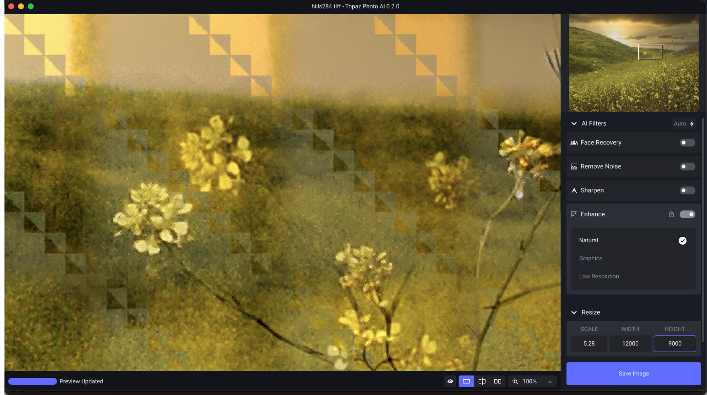 Finally got it downloaded and installed. Background: I have to process a range photo types, including my landscape work that may be printed at large sizes 40 X 60 inches. For this I use Gigapixel or Sharpen AI for the final polish. On the opposite end of the photo types, I also do graphic design for magazine style annual reports and I am regularly provided with very low quality images. These have very severe problems, either sharpness or resolution or noise or poor tonal scale (brightness and contrast), often all of these problems are present. My initial impression of Photo AI. I would not use it on my landscape work, but I could see it being very useful on the poor quality photos I am provided when doing the magazine style annual report graphic design work.