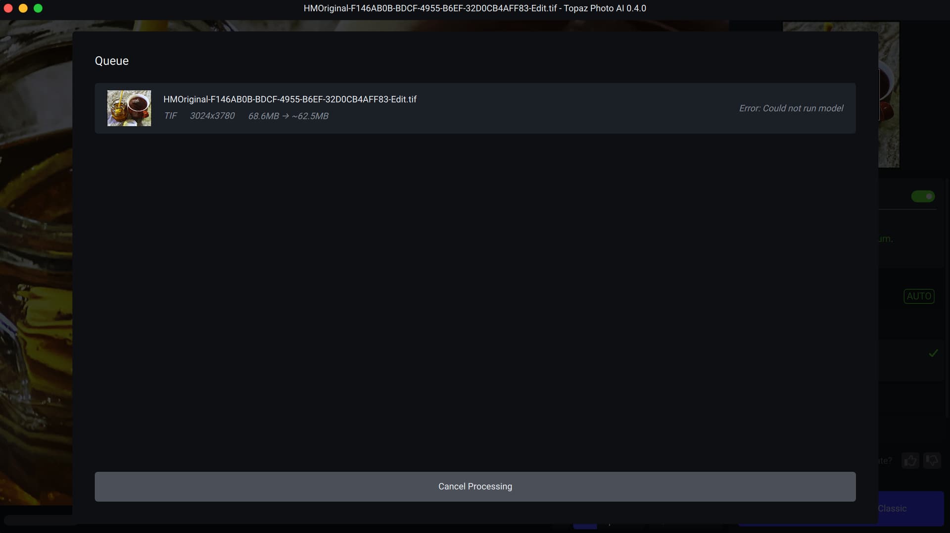There seems to be a limit on the image size. I am getting the error “Could not run model” on almost every round-trip to Adobe Lightroom. When I process a smaller size image as a stand-alone, the image processes fine.