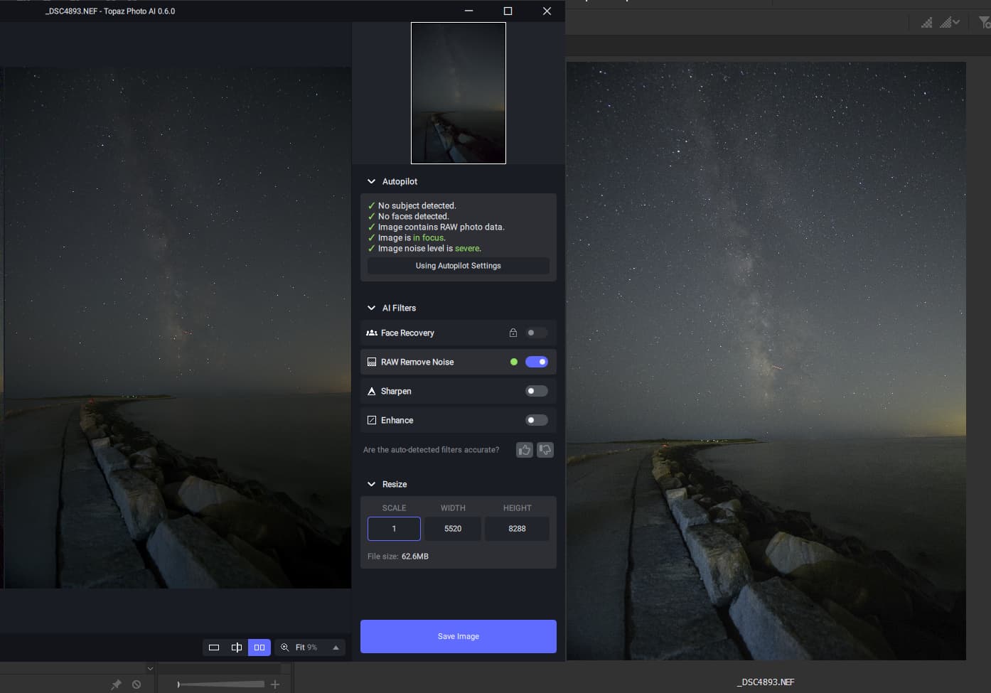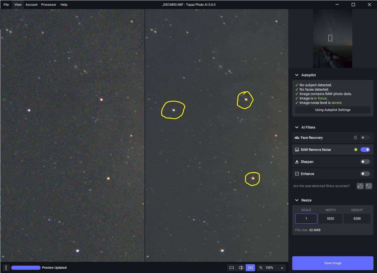 I use Denoise AI and Sharpen AI heavily, especially for infrared and astrolandscape work. I just pulled a night image into PAI and notice that it renders the image darker than it is. I compared the image to ACR and Nikon NX and these two programs render the image similarly. I pulled the same image into Denoise AI and it didnāt darken it as PAI did. When PAI processed the image (only removing noise) it added artifacts to the stars, making them appear somewhat blurry (oval) when they were actually sharp (round). It did handle the noise very well though!