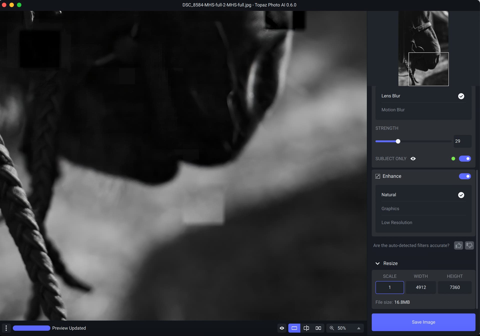 Photo AI v 06. Mac M1. There is a small squarish area in my image that seems to be “inverted” as shown in the attached photo. Original JPEG. Output JPEG.