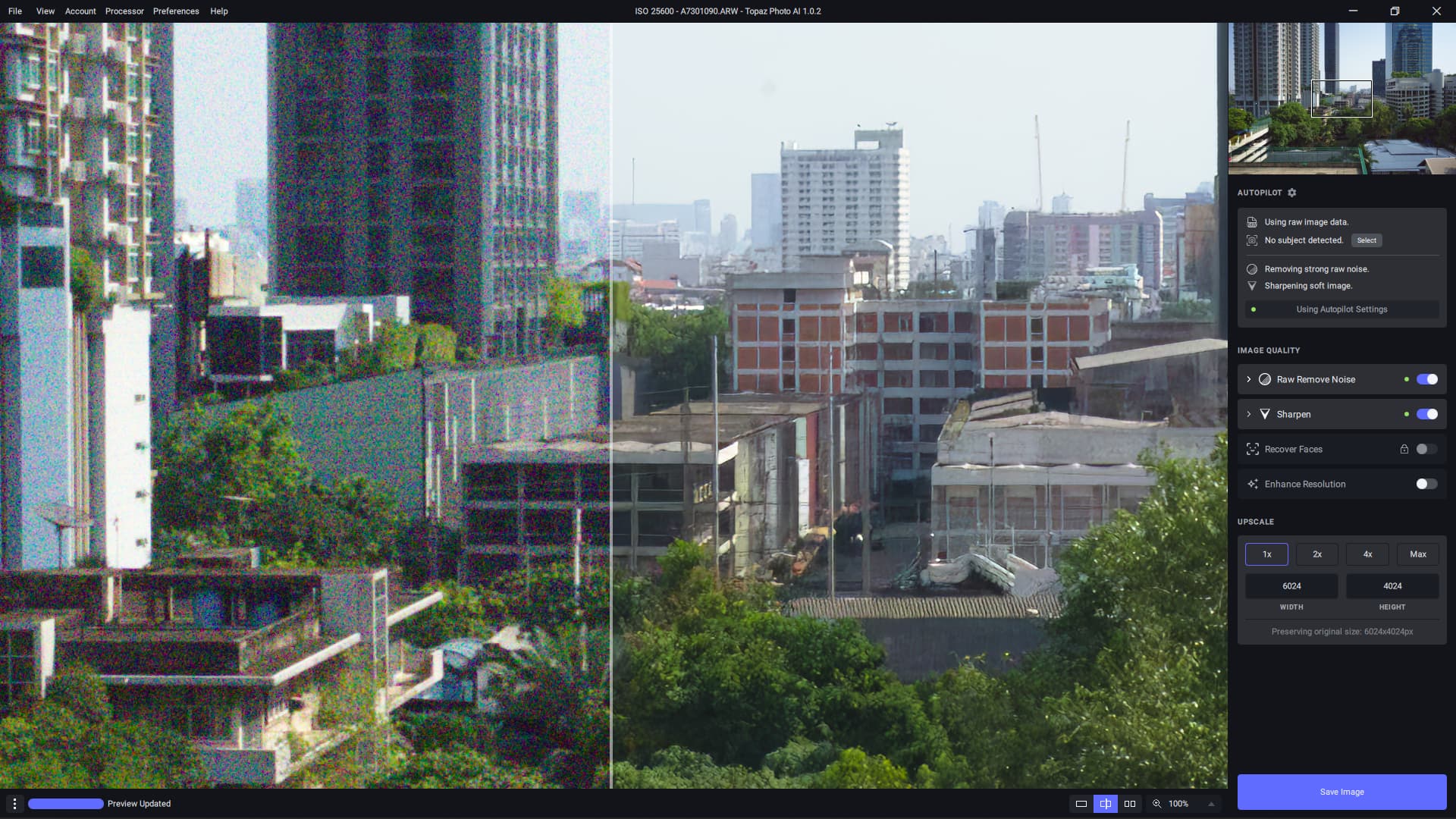 Reduce Noise seems to create smearing or double-edges at contrasty edges. This is further emphasized when Sharpening and Upscaling are used. I can only post previews, though, because I don’t own a license.