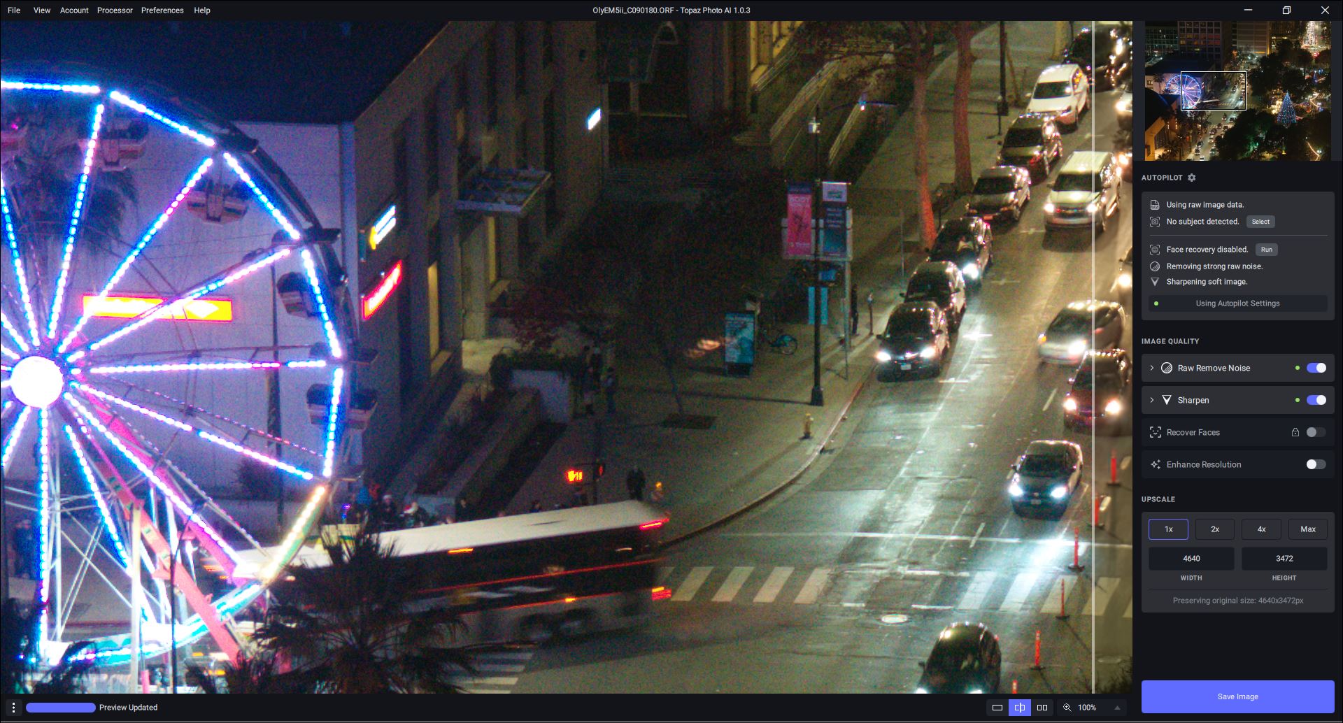 Ran AutoPilot. Test image (see street photo scene image below - no faces) retained photographic-quality with the AP processing. There are lots of small textural details in the image. Details did not get overly-smoothed, halo-d or converted to odd wavy shapes. Retained a photographic quality. Both zoomed in in the UI & pulled back to normal view.