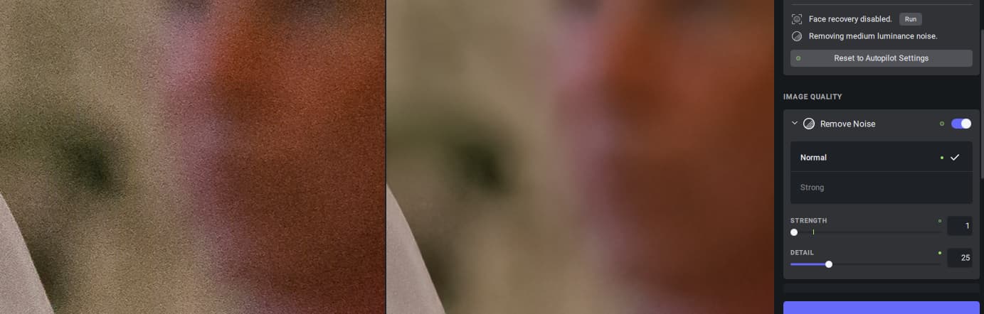 So, for my test picture, Autopilot chooses “medium luminance noise” and still the slider “Strength” does not have any visual effect. The noise is just heavily removed, no matter if Strength is 1 or 100.