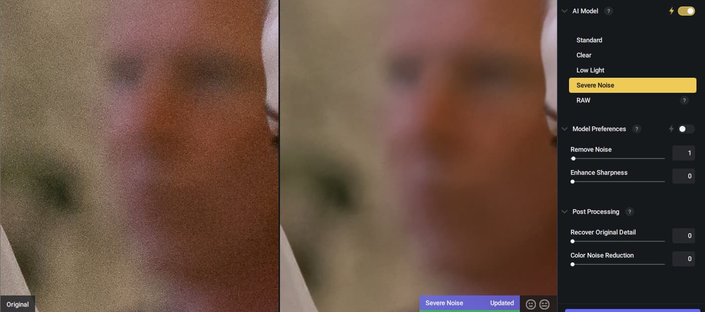In DeNoise AI I get the same result for AI model “Severe Noise”, also the Slider “Remove Noise” has no visible difference between 1 and 100.
