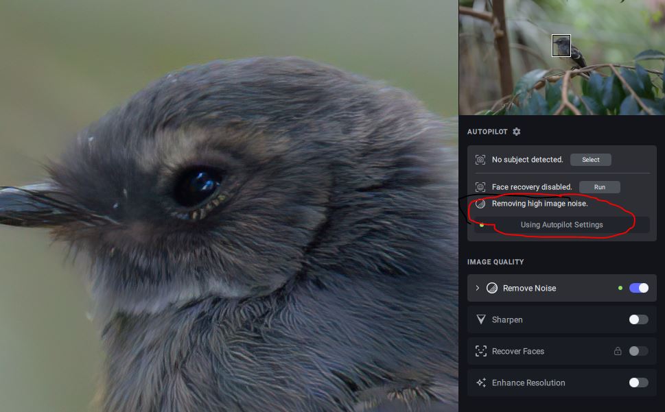 What happens when you run that same image (where you’ve circled “Removing high image noise” in the Settings Panel) & get the result you’ve included a zoomed in result of above - if you go down to the little arrow pointing to “Remove Noise” & you click on that to expand the Settings for Remove Noise. You should be able to manually make your own modifications to the A.P.-selected denoise settings. Are you able to do that? If so - is there enough buffer room on the denoise slider to lessen the amt of denoising somewhat & perhaps pull up the detail or clarity a bit in that same Remove Noise part of the settings panel? Does that help you at all?